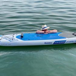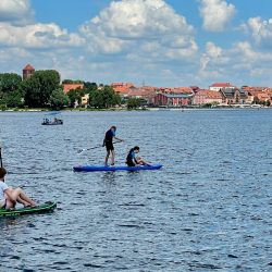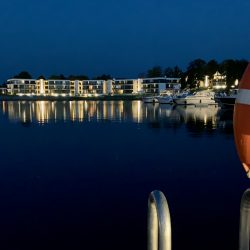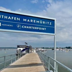Der Badetag auf der Müritz im Bereich des Ostufers ist einfach nur wunderschön – auch wenn die Kinder sich köstlich amüsieren, wenn Mama oder Papa vom Stand-Up-Board in den See platschen und Mühe haben, wieder aufzusteigen. Nach Eldenburg wollen wir die kommende Nacht nicht zurück. Warum nicht mal die neue Marina vor der Ferienanlage „MareMüritz“ ausprobieren? Vom Wasser aus sieht sie weitaus weniger gewaltig aus als beim Spaziergang an Land. Die Stege sind noch spärlich belegt, die Bootsboxen schön groß, so dass das Anlegen ein Kinderspiel ist. Allerdings muss man beim Aussteigen aufpassen – auf den noch wenig genutzten Stegen haben Enten und Gänse einiges hinterlassen.