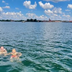 Also, wieder ein Badetag – so wollen es die Kids, so soll es sein. Langsam müssten sie ja Schwimmhäute haben, doch sie kriegen einfach nicht genug vom Herumtoben in der Müritz und im Kölpinsee. Zum Glück haben wir genug Essensvorräte an Bord, denn nach dem Baden brauchen die Jungs eine ordentliche Stärkung. Tja, und die nächste Nacht? Klar, wir wollen wieder nach Eldenburg, Hafen-Heino empfängt uns, und abends bekommen wir sogar im Restaurant einen Platz. Unsere Hündin findet gleich wieder vierbeinige Freunde, und wir viele nette Gesprächspartner.