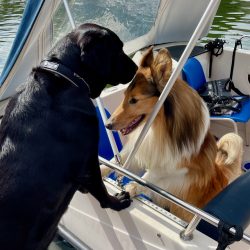 Klar, dass es am nächsten Morgen wieder Frühstück im „Hafenrestaurant“ gibt. Und wieder eine glatte „Note 1“. Jetzt wollen wir mal Waren (Müritz) vom Wasser aus erkunden. Im Kanal selbst ist mit so einem großen Hausboot viel Erfahrung gefragt, zumal es hier und da doch ein paar „Rüpel“ gibt, die meinen, ordentlich Gas geben und überholen zu müssen. Im Großen und Ganzen verhalten sich die Bootsführer aber vernünftig. Und – das lernt man schon am ersten Tag – man grüßt sich. Das sorgt gleich für gute Laune. Nach monatelangem Lockdown und dementsprechend vielen Menschen, die nicht so gut drauf waren, eine echte Wohltat. Auch unsere Hündin findet inzwischen Gefallen am Bootfahren – sie hat sich einen Platz gesucht, von dem aus sie alles im Blick hat.