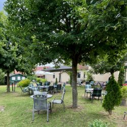 Es geht in Richtung „Wirtshaus zur Eibe“. Ein ordentliches Stück bei ziemlich hohen Temperaturen. Anstrengend für den Hund und alle anderen. Doch an der „Eibe“ erwartet uns ein lauschiges Plätzchen im Schatten unter Bäumen und eine zuvorkommende Bedienung. Als erstes bekommt die Hündin Wasser, das sie dankbar sofort ausschlürft. Die Karte ist umfangreich, die Gerichte einfach, aber lecker. Jeanette hat die „Eibe“ erst vor kurzem übernommen – mitten in der Corona-Zeit. Sie versucht, auf eigenen Beinen zu stehen. Das geht momentan aber noch nicht, ohne einen anderen Job. Nebenher arbeitet die Betreiberin der „Eibe“ noch in der Pflege. Hut ab! Die Kinder bekommen ihre Pommes – ohne etwas dazu bestellen zu müssen, und sind happy.