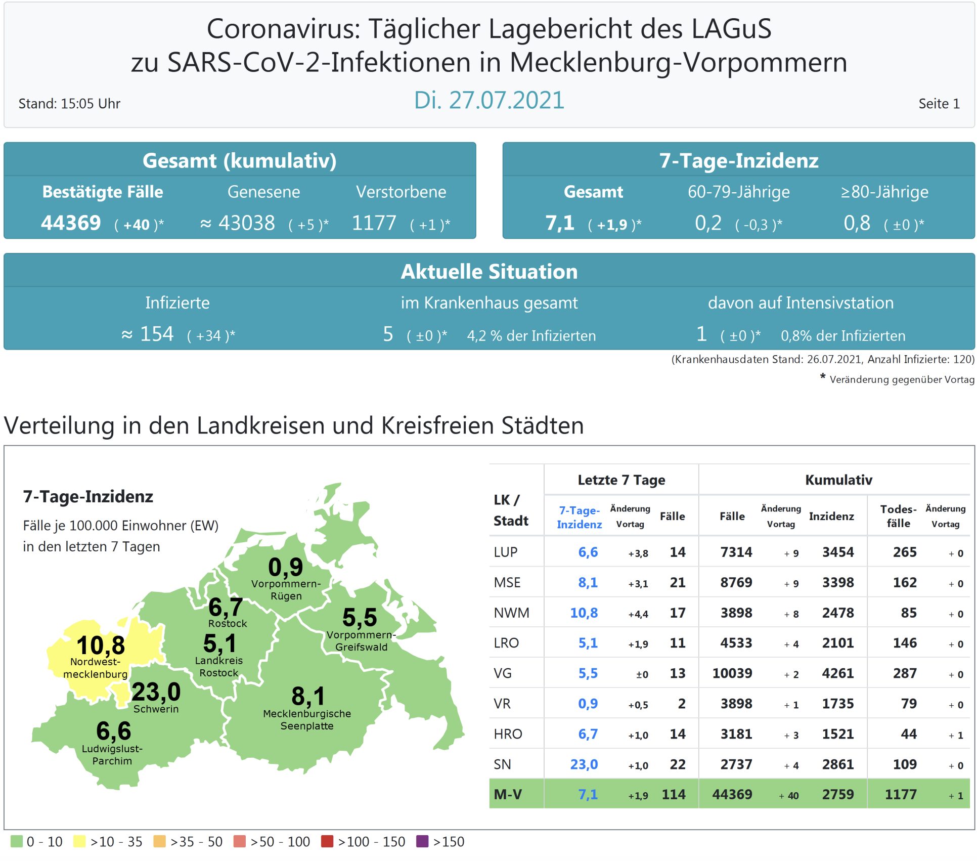 Der Inzidenzwert von ganz Mecklenburg-Vorpommern liegt bei 7,1. Das Land Mecklenburg-Vorpommern meldet heute 40 Neuinfektionen und einen neuen Todesfall.