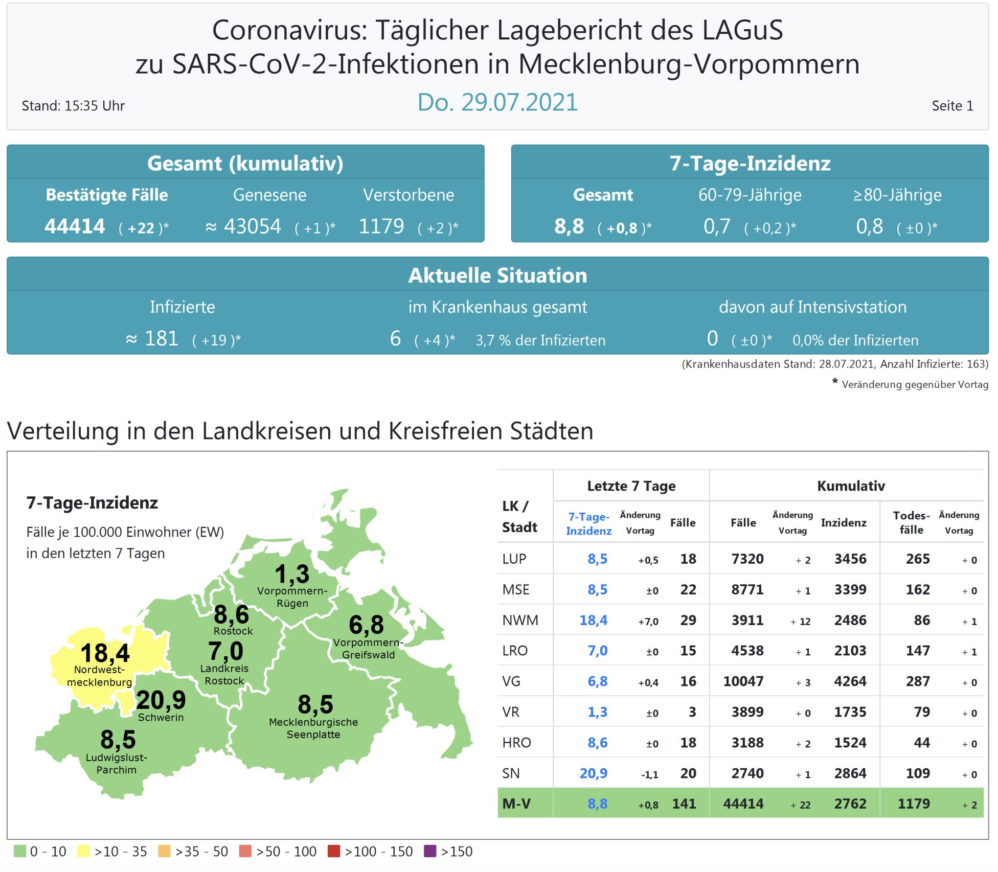 Der Inzidenzwert von ganz Mecklenburg-Vorpommern ist erneut gestiegen und liegt heute bei 8,8 (gestern 8,1). Das Land Mecklenburg-Vorpommern meldet heute 22 Neuinfektionen und einen zwei neue Todesfälle. Die höchste Inzidenz im Land hat derzeit die Stadt Schwerin mit 20,9.