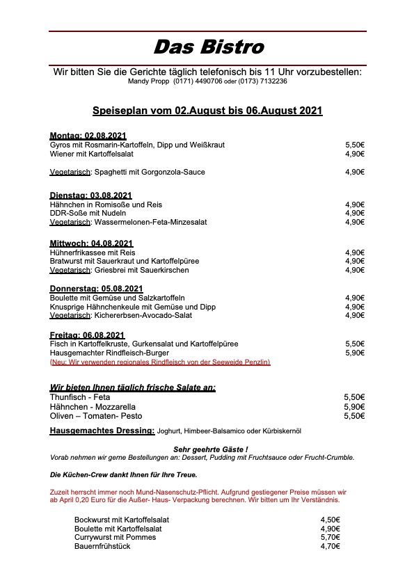 Gyros mit Rosmarinkartoffeln und Dipp sowie Weißkraut, Wiener mit Kartoffelsalat sowie Spaghetti mit Gorgonzola-Soße – so beginnt die neue Woche in „Das Bistro“ am Warener Amtsbrink.