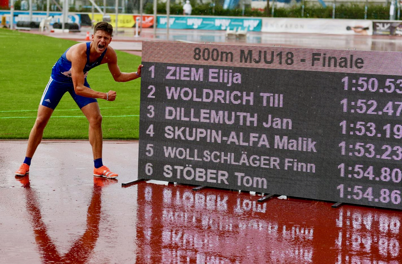 Waren hat einen Deutschen Meister! Nur zwei Wochen, nachdem Elija Ziem bei den Norddeutschen Meisterschaften U20 über 800 Meter die Goldmedaille gewonnen hat (WsM berichtete), rannte er gestern bei den Deutschen Meisterschaften  U18/U20 in Rostock  ebenfalls auf seiner 800-Meter-Parade-Strecke auf den obersten Podestplatz. Und das trotz Dauerregens in neuer persönlicher Bestzeit. Er ist somit Deutscher Meister und steht jetzt mit seiner Zeit  von 1:50,53 Minuten auch an der Spitze der U18-Jahresbestenliste. Einen Tag zuvor holte der 17-Jährige Warener, der beim SC Neubrandenburg trainiert, die Silbermedaille über 400 Meter, also den Vize-Meister-Titel.