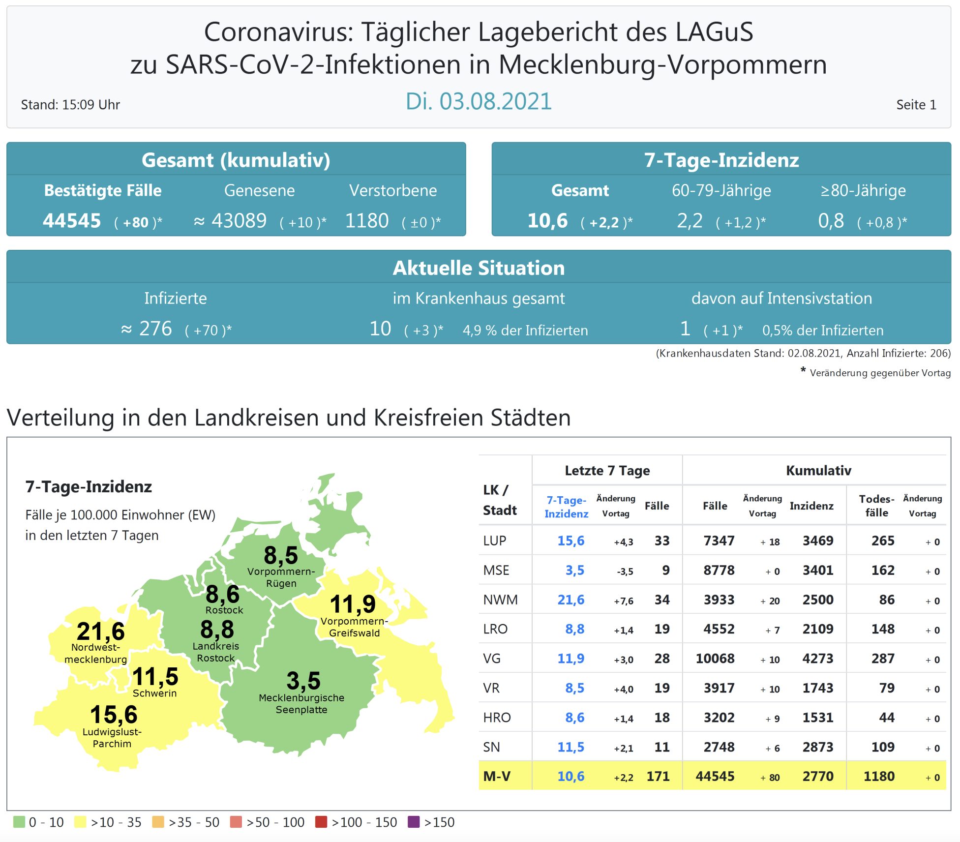 Der Inzidenzwert von ganz Mecklenburg-Vorpommern ist dagegen gestiegen und liegt heute bei 10,6 (gestern 8,4). Das Land Mecklenburg-Vorpommern meldet heute 80 Neuinfektionen und keinen neuen Todesfall. Die höchste Inzidenz im Land hat derzeit der Landkreis Nordwest-Mecklenburg mit 21,6.