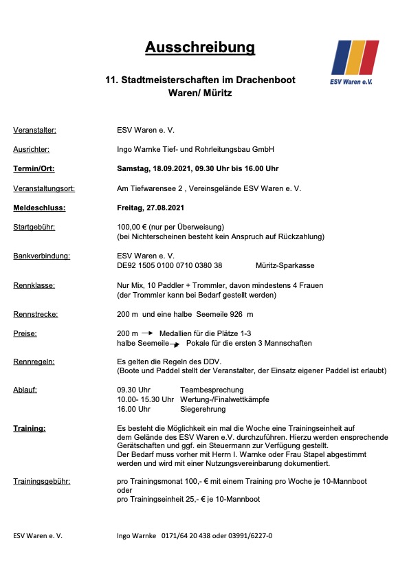 Der ESV bietet im Vorfeld Trainingseinheiten an. Anmeldungen bitte per Mail an Ingo Warnke info@ingo-warnke.de. Firmen bzw. Vereine, die keine eigene Mannschaft bilden können, können zu einem Team zusammenführt werden.