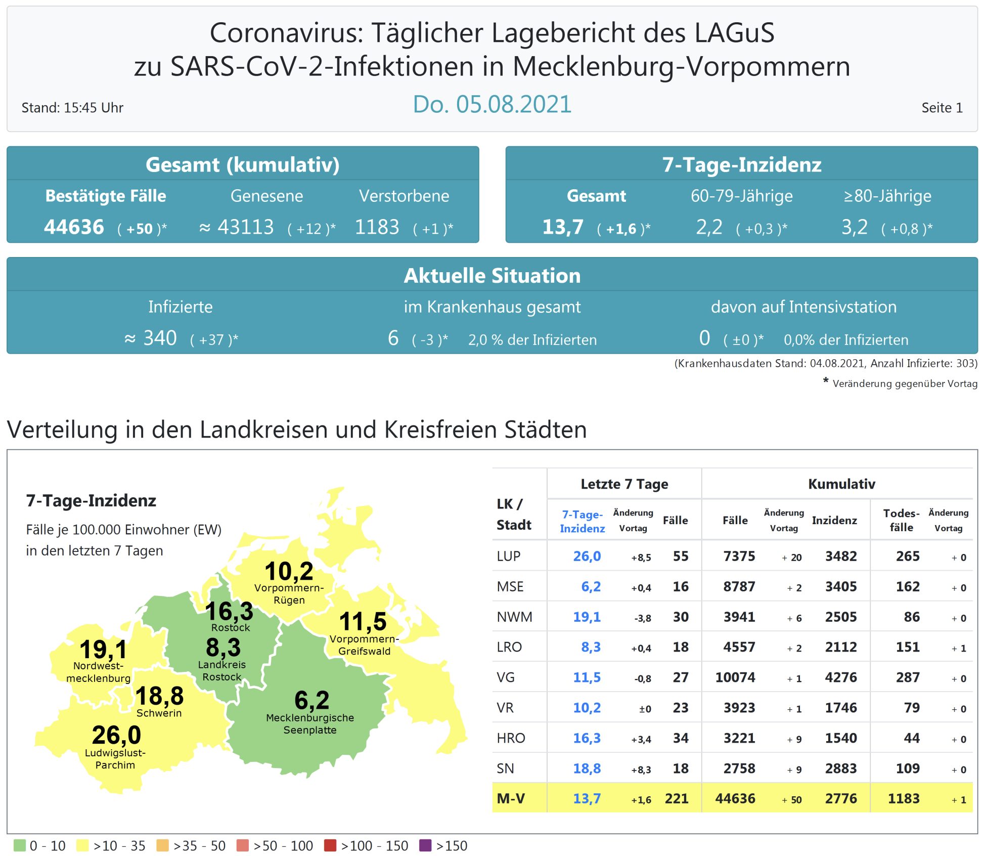 Der Inzidenzwert von ganz Mecklenburg-Vorpommern ist weiter gestiegen und liegt heute bei 13,7 (gestern 12,1). Das Land Mecklenburg-Vorpommern meldet heute 50 Neuinfektionen und einen neuen Todesfall. Die höchste Inzidenz im Land hat derzeit der Landkreis Ludwigslust-Parchim mit 26,0.