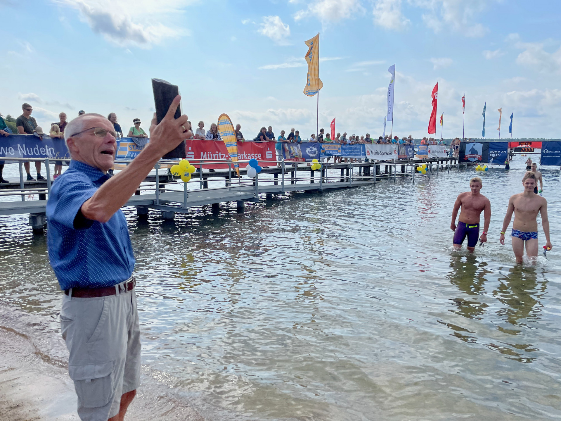 Ganz unaufgeregt schien der älteste Teilnehmer des diesjährigen Müritzschwimmens. Mit der Startnummer 1 machte sich der 88-Jährige Ernst Siegfried Heideck aus Neubrandenburg auf den Weg und stieg nicht als letzter aus der Müritz. „War gut“, so sein kurzer und ziemlich entspannter Kommentar direkt nach der Ankunft zu Katrin Oesterheld, die als Moderatorin auch in diesem Jahr wieder mit ihrer lockeren, humorvollen Art glänzte.