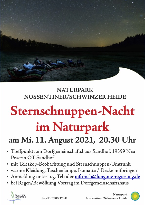 Auch in diesem Jahr lädt der Naturpark Nossentiner/Schwinzer Heide zu einer Sternschnuppennacht ein, und zwar am morgigen 11. August. Im August werden die Tage wieder kürzer. Doch dies hat auch sein Gutes: so kann man wieder Sternschnuppen beobachten. Sternschnuppen, wissenschaftlich als Meteore bezeichnet, sind Gesteins- und Staubteilchen, die in der Hochatmosphäre verglühen. Der bekannteste Meteorstrom sind die Perseiden. Jedes Jahr um den 12. August kreuzt die Erde auf ihrem Weg um die Sonne die Umlaufbahn der Teilchen dieses Stroms.