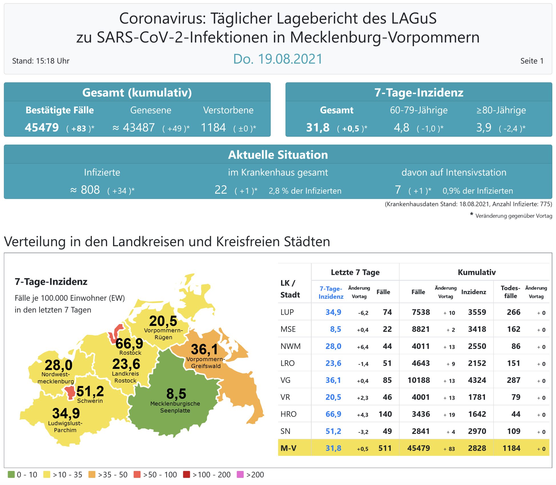 Der Inzidenzwert von ganz Mecklenburg-Vorpommern ist weiter gestiegen und liegt heute bei 31,8 (gestern 31,4). Das Land Mecklenburg-Vorpommern meldet heute 83 Neuinfektionen und keinen neuen Todesfall. Die höchste Inzidenz im Land hat die Stadt Rostock mit 66,9.