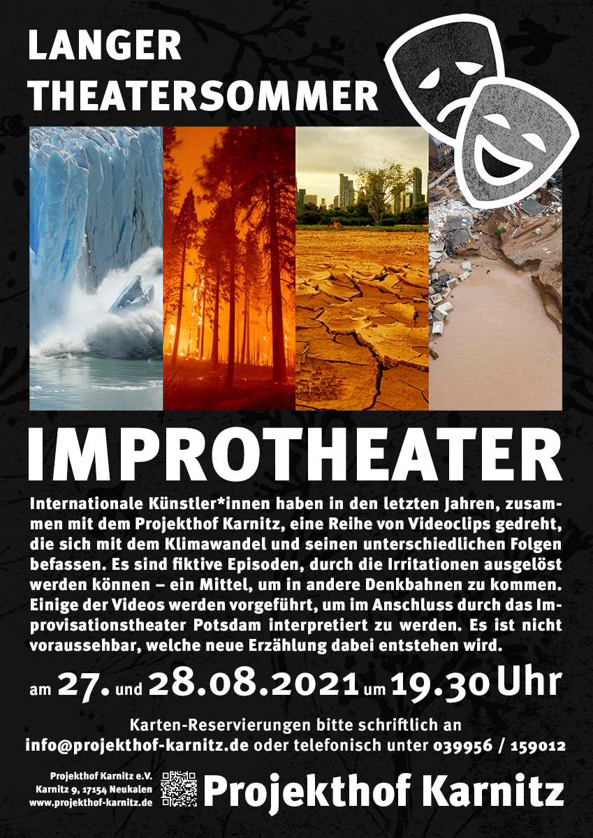 Improtheater heißt es am morgigen Freitag und am Sonnabend jeweils ab 19.30 Uhr auf dem Projekthof Karnitz. Internationale Künstler haben in den letzten Jahren zusammen mit dem Projekthof Karnitz eine Reihe von Videoclips gedreht, die sich mit dem Klimawandel und seinen unterschiedlichen Folgen befassen. Es sind fiktive Episoden, durch die Irritationen ausgelöst werden können – ein Mittel, um in andere Denkbahnen zu kommen.