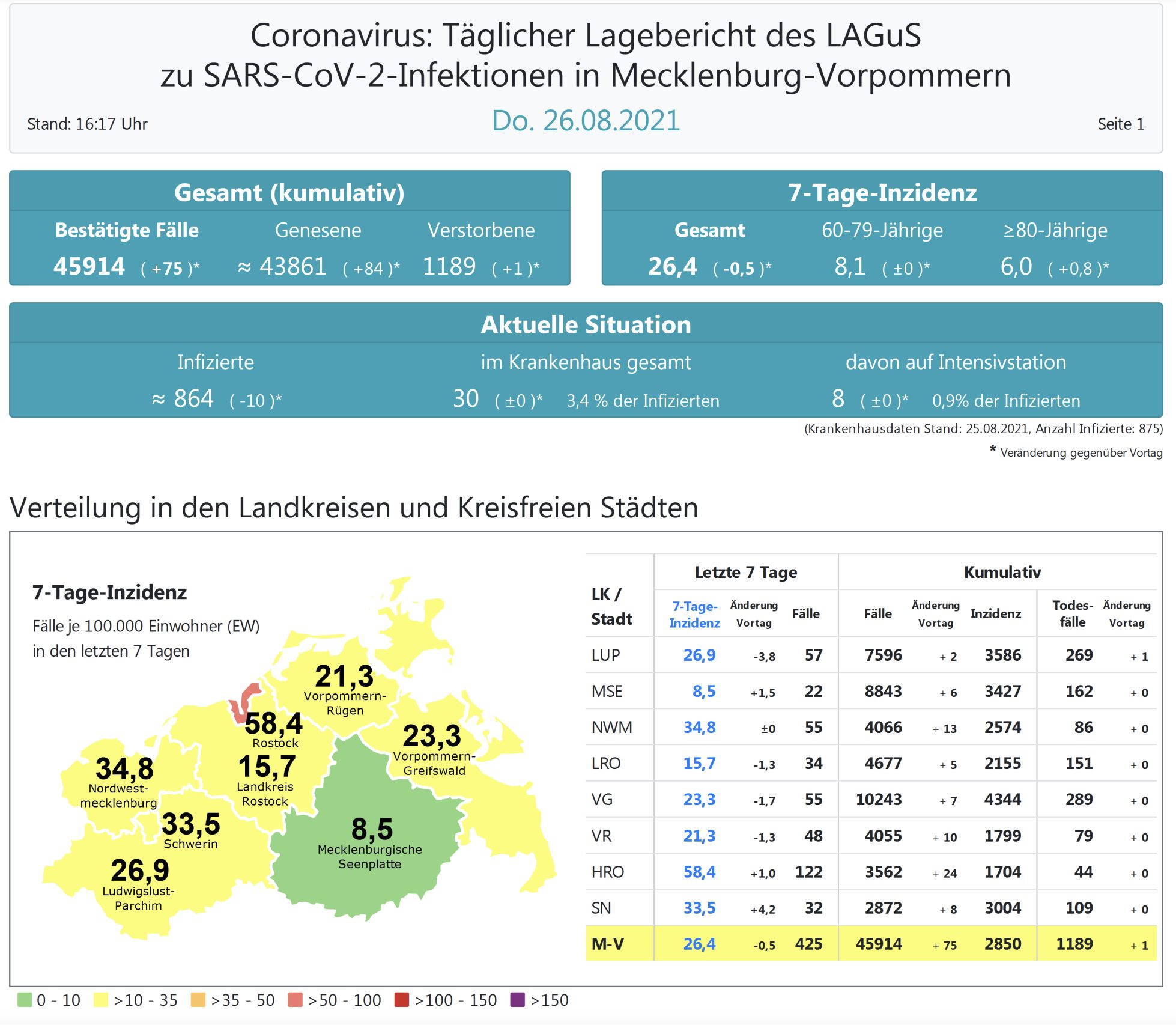 Der Inzidenzwert von ganz Mecklenburg-Vorpommern ist leicht zurückgegangen und liegt heute bei 26,4 (gestern 27,0). Das Land Mecklenburg-Vorpommern meldet heute 75 Neuinfektionen und einen neuen Todesfall. Die höchste Inzidenz im Land hat die Stadt Rostock mit 58,4.