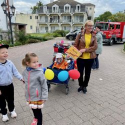 Die Feuerwehr kam am Montag vorbei, da ging es dann auch gleich hoch in die Lüfte. Dienstag gab es eine Bootstour mit der Fontane auf der Müritz, am Mittwoch zogen die Klinker Knirpse gemeinsam mit der Feuerwehr durchs Dorf zum Bauernmarkt. Mit gedichteten Liedern verabschiedeten sich die Hortkinder von ihrer Frau Bethke.