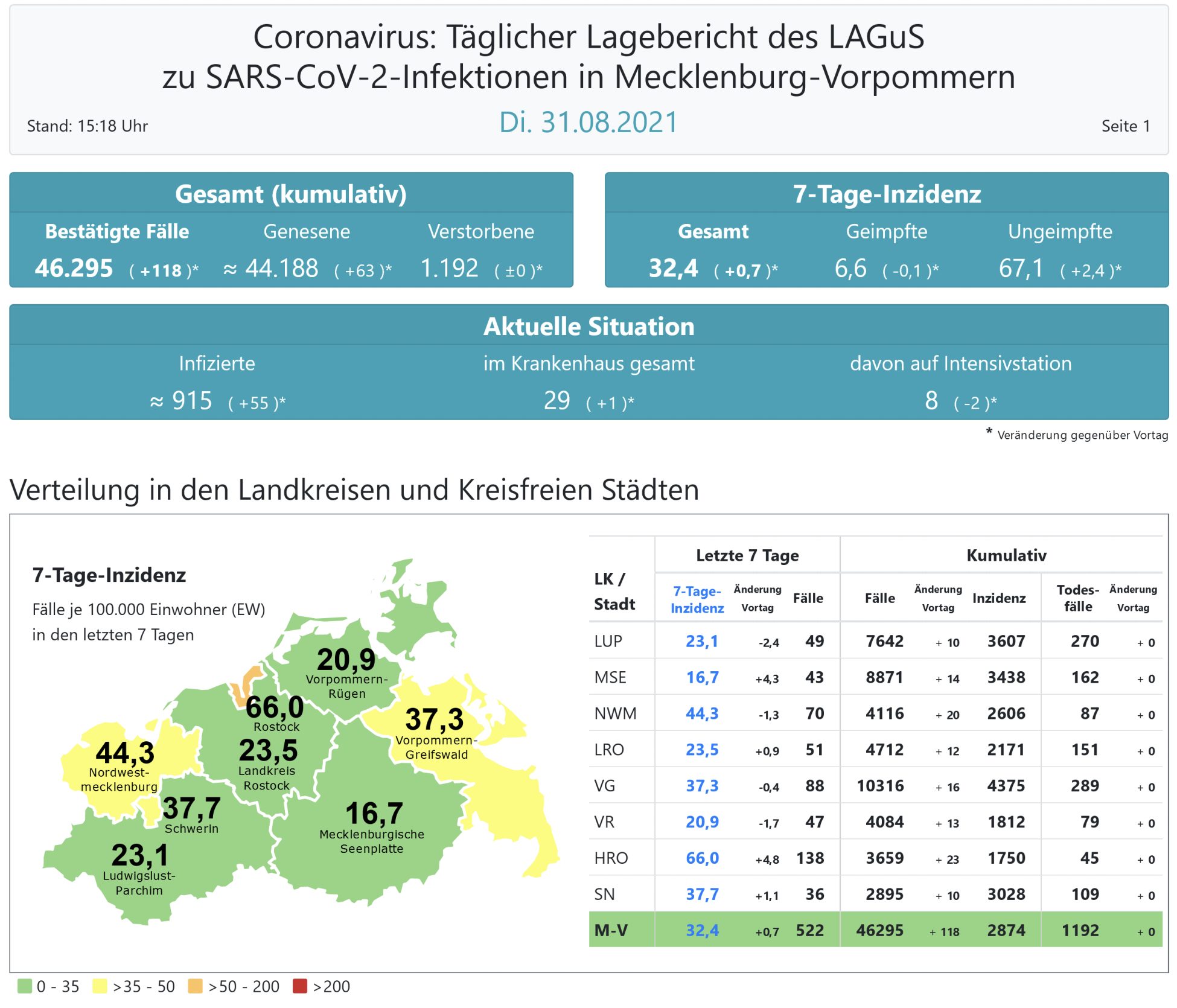 Der Inzidenzwert von ganz Mecklenburg-Vorpommern ist ebenfalls gestiegen und liegt heute bei 32,4 (gestern 31,7). Das Land Mecklenburg-Vorpommern meldet heute 118 Neuinfektionen und keinen neuen Todesfall. Die höchste Inzidenz im Land hat die Stadt Rostock mit 66,0.