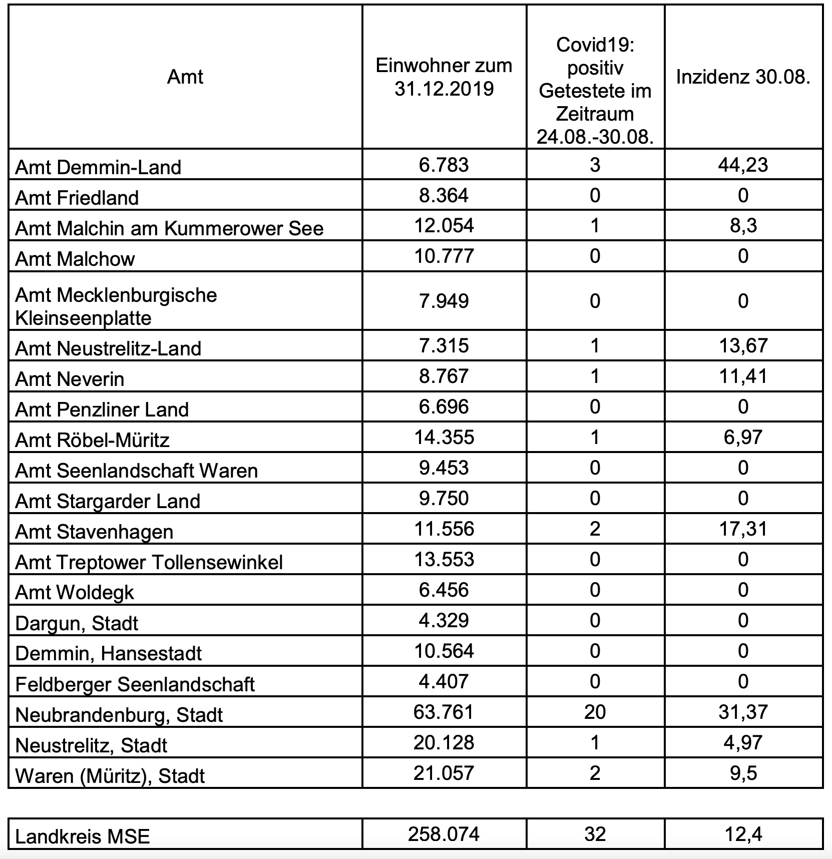 Die Inzidenz an der Mecklenburgischen Seenplatte ist deutlich angestiegen. Sie liegt heute bei 16,7 (gestern 12,4). Der Landkreis meldet heute keinen neuen Todesfall und 14 Neuinfektionen.