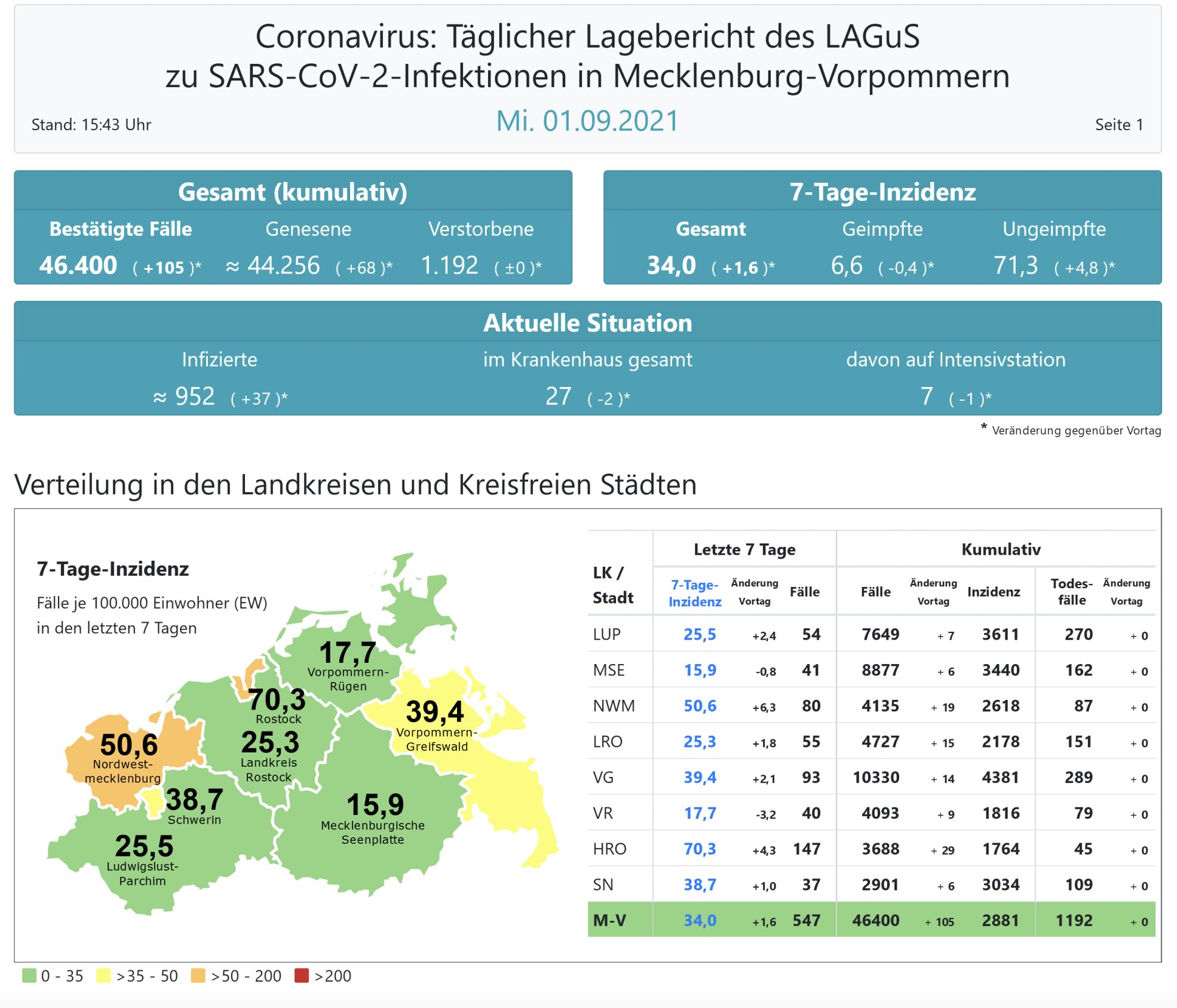 Der Inzidenzwert von ganz Mecklenburg-Vorpommern ist dagegen weiter gestiegen und liegt heute bei 34,0 (gestern 32,4). Das Land Mecklenburg-Vorpommern meldet heute 105 Neuinfektionen und keinen neuen Todesfall. Die höchste Inzidenz im Land hat die Stadt Rostock mit 70,3.