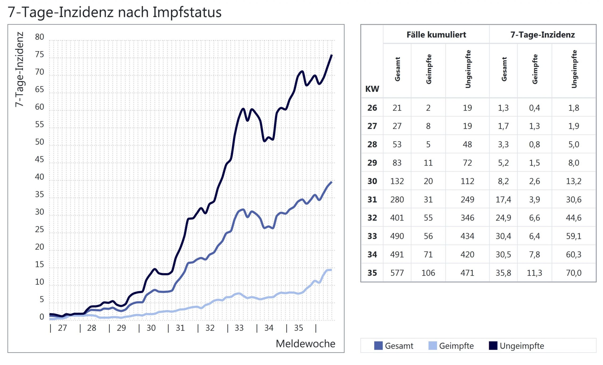 Unter diesem Artikel finden Sie, liebe Leser, nicht nur die bekannte Grafik des Landesamtes für Gesundheit zu den Corona-Fällen, sondern auch eine Grafiken zu den Inzidenzen – unterteilt in Geimpfte und Ungeimpfte.