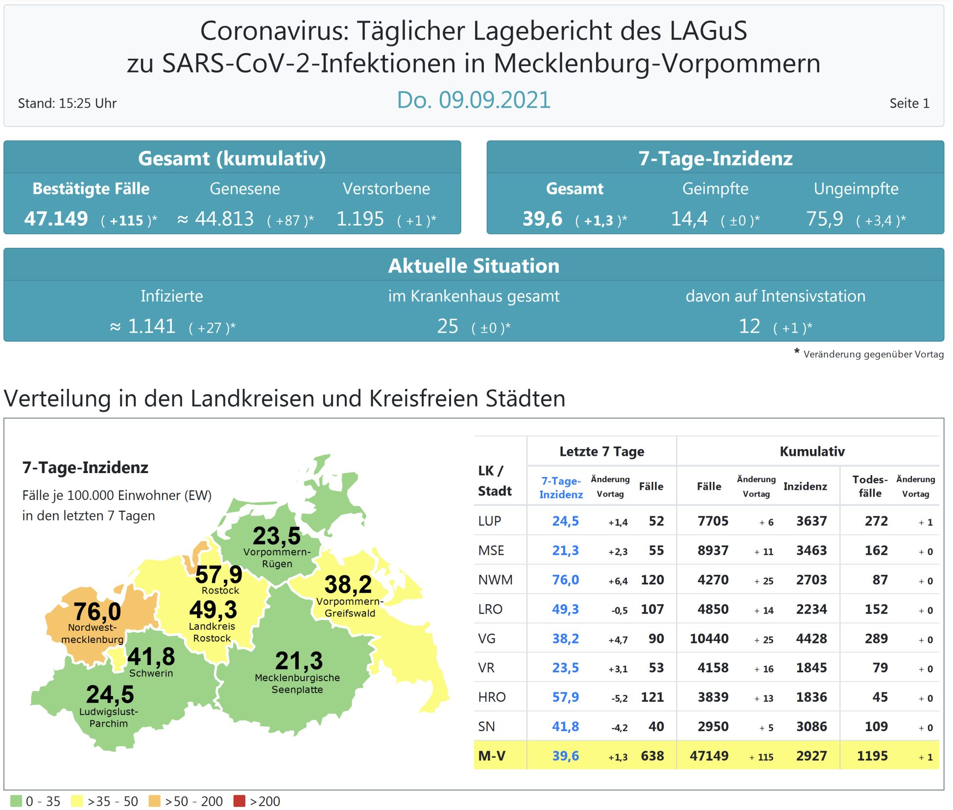 Der Inzidenzwert von ganz Mecklenburg-Vorpommern ist ebenfalls gestiegen und liegt heute bei 39,6 (gestern 38,4). Das Land Mecklenburg-Vorpommern meldet heute 115 Neuinfektionen und einen neuen Todesfall. Die höchste Inzidenz im Land hat der Landkreis Nordwestmecklenburg mit 76,0.