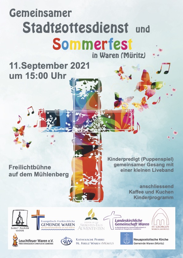 Wie schon seit einigen Jahren, gibt es auch in diesem September wieder einen ökumenischen Stadtgottesdienst in Waren. Am morgigen Sonnabend, 11. September, treffen sich um 15 Uhr auf der Freilichtbühne am Mühlenberg Christen aus acht Gemeinden mit Bürgern sowie Gästen der Stadt Waren, um gemeinsam Gottesdienst zu feiern.
