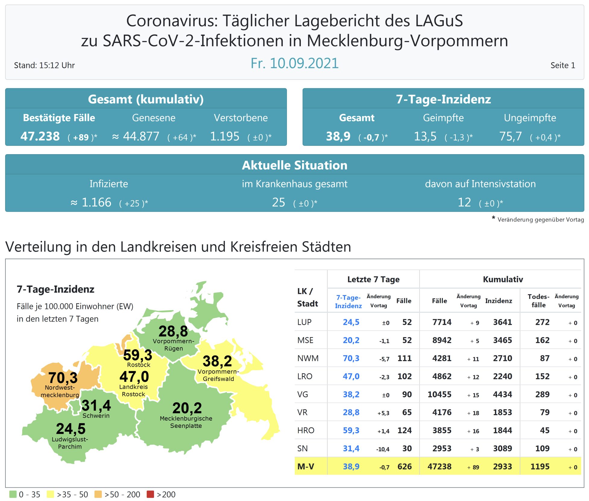 Der Inzidenzwert von ganz Mecklenburg-Vorpommern ist ebenfalls gesunken und liegt heute bei 38,9 (gestern 39,6). Das Land Mecklenburg-Vorpommern meldet heute 89 Neuinfektionen und keinen neuen Todesfall. Die höchste Inzidenz im Land hat der Landkreis Nordwestmecklenburg mit 70,3.