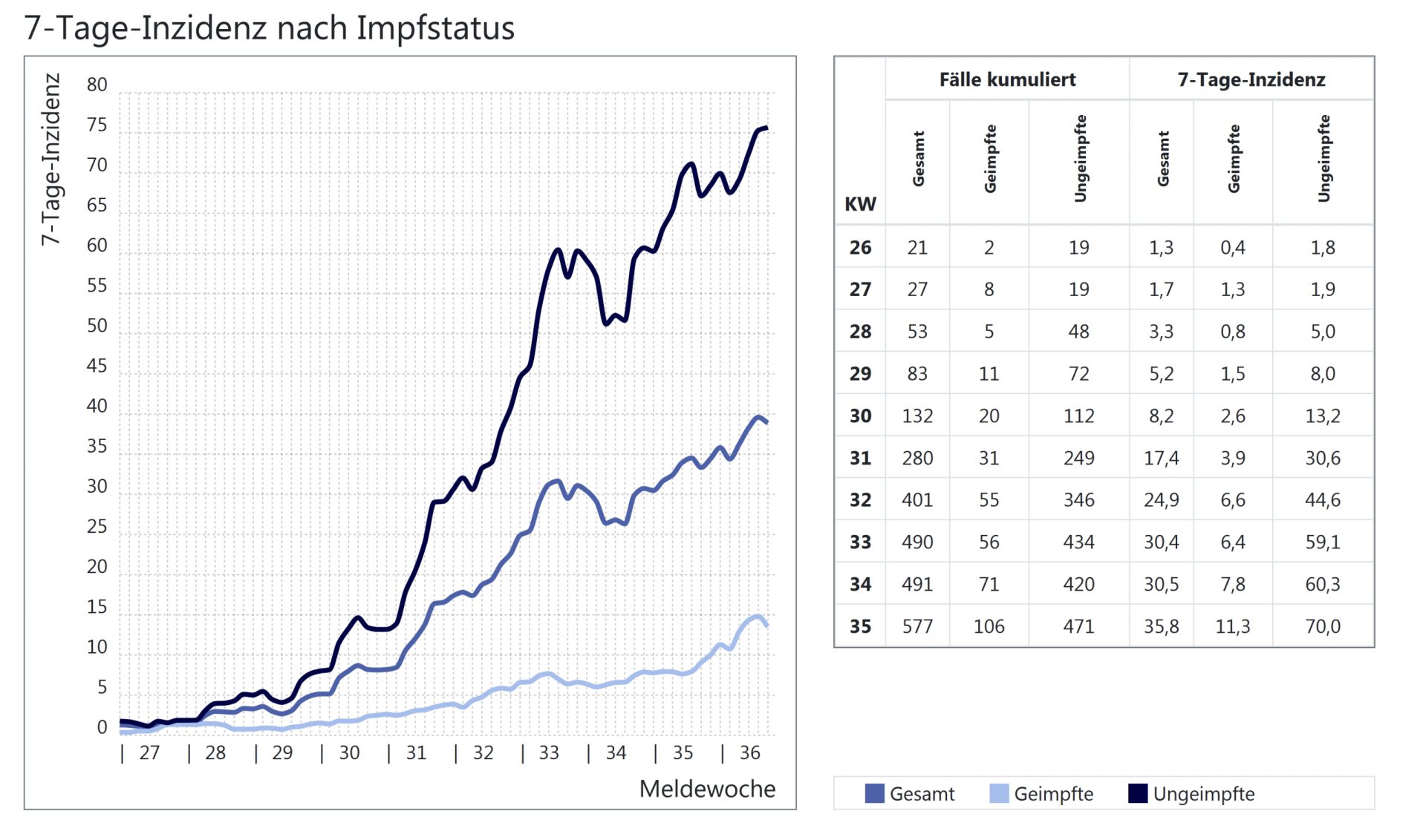 Unter diesem Artikel finden Sie, liebe Leser, nicht nur die bekannte Grafik des Landesamtes für Gesundheit zu den Corona-Fällen, sondern auch eine Grafiken zu den Inzidenzen – unterteilt in Geimpfte und Ungeimpfte.