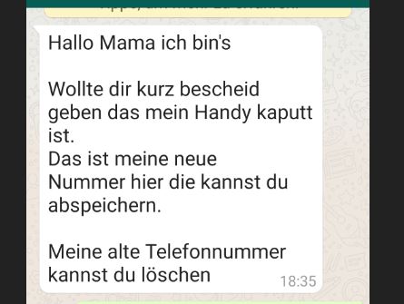 Eine 70-Jährige aus dem Raum Greifswald erhielt in der vergangenen Woche eine WhatsApp von einer ihr unbekannten Nummer. Ihre angebliche Tochter teilte ihr mit, dass sie ein neues Handy habe und das ihre neue Nummer sei. Kurze Zeit später bat die angebliche Tochter die deutsche Geschädigte darum, für sie zwei Überweisungen vorzunehmen, da das Onlinebanking mit dem neuen Handy noch nicht funktionieren würde. Die 70-Jährige nahm die Überweisungen vor und schickte ihrer „Tochter“ Bilder davon per WhatsApp. Es folgten Dankesworte und etwas später
