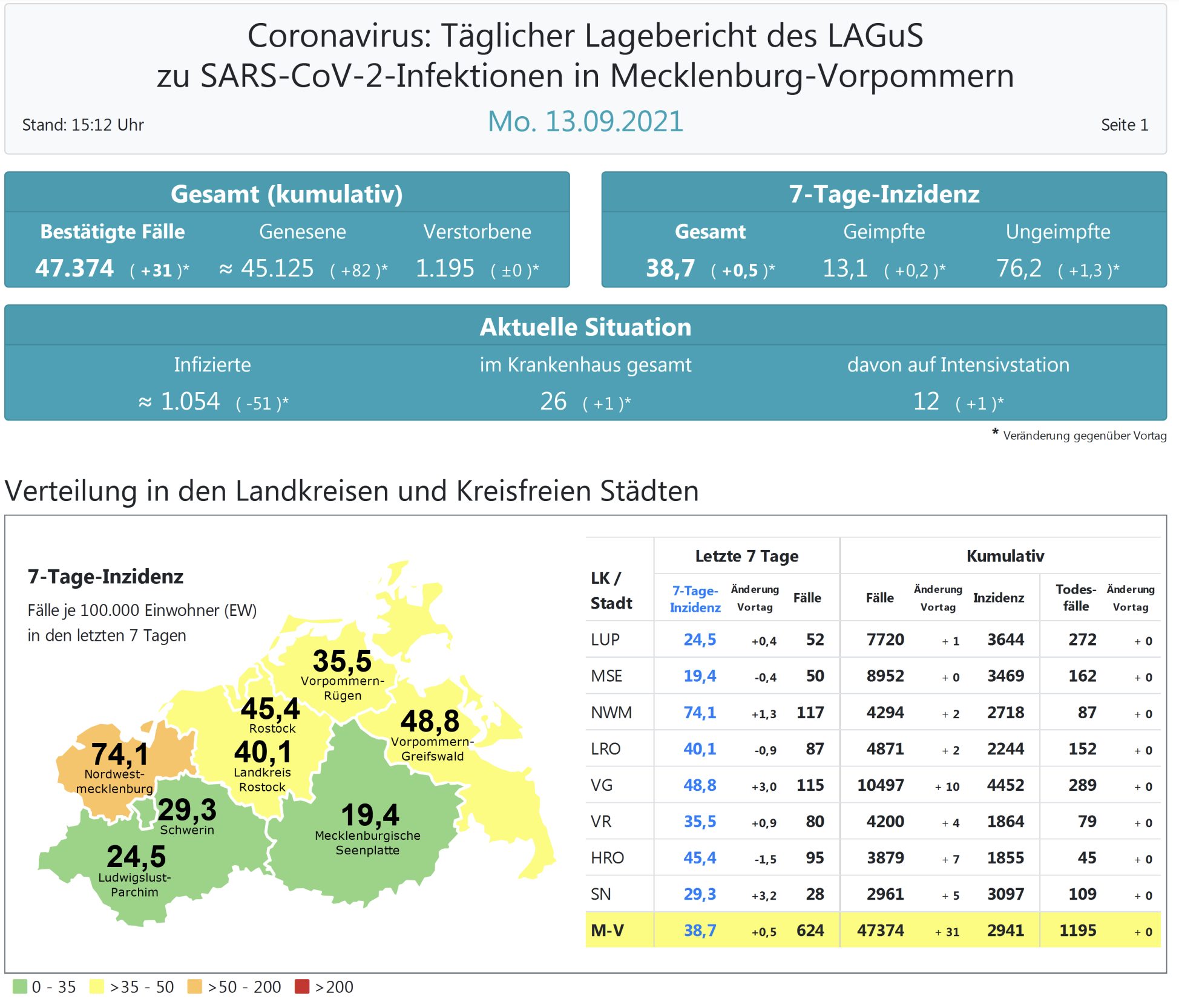 Der Inzidenzwert von ganz Mecklenburg-Vorpommern ist leicht gestiegen und liegt heute bei 38,7 (gestern 38,2). Das Land Mecklenburg-Vorpommern meldet heute 31 Neuinfektionen und keinen neuen Todesfall. Die höchste Inzidenz im Land hat der Landkreis Nordwestmecklenburg mit 74,1.