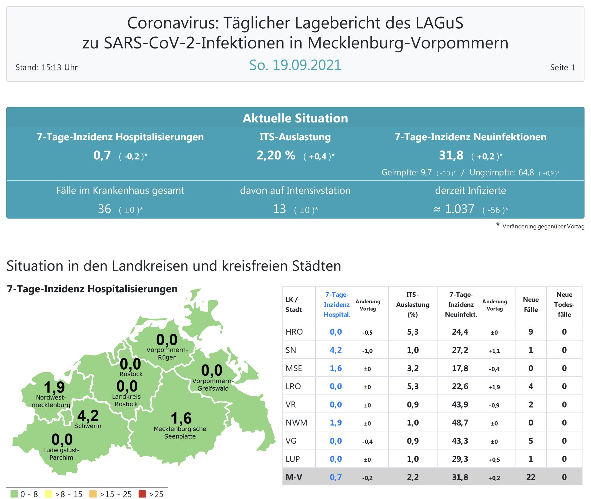 Die Hospitalisierung in ganz Mecklenburg-Vorpommern wird heute mit 0,7 angegeben (gestern 0,9). Das Land Mecklenburg-Vorpommern meldet heute 22 Neuinfektionen und keinen neuen Todesfall. Den höchsten Hospitalisierungswert hat weiterhin die Stadt Schwerin mit 4,2.