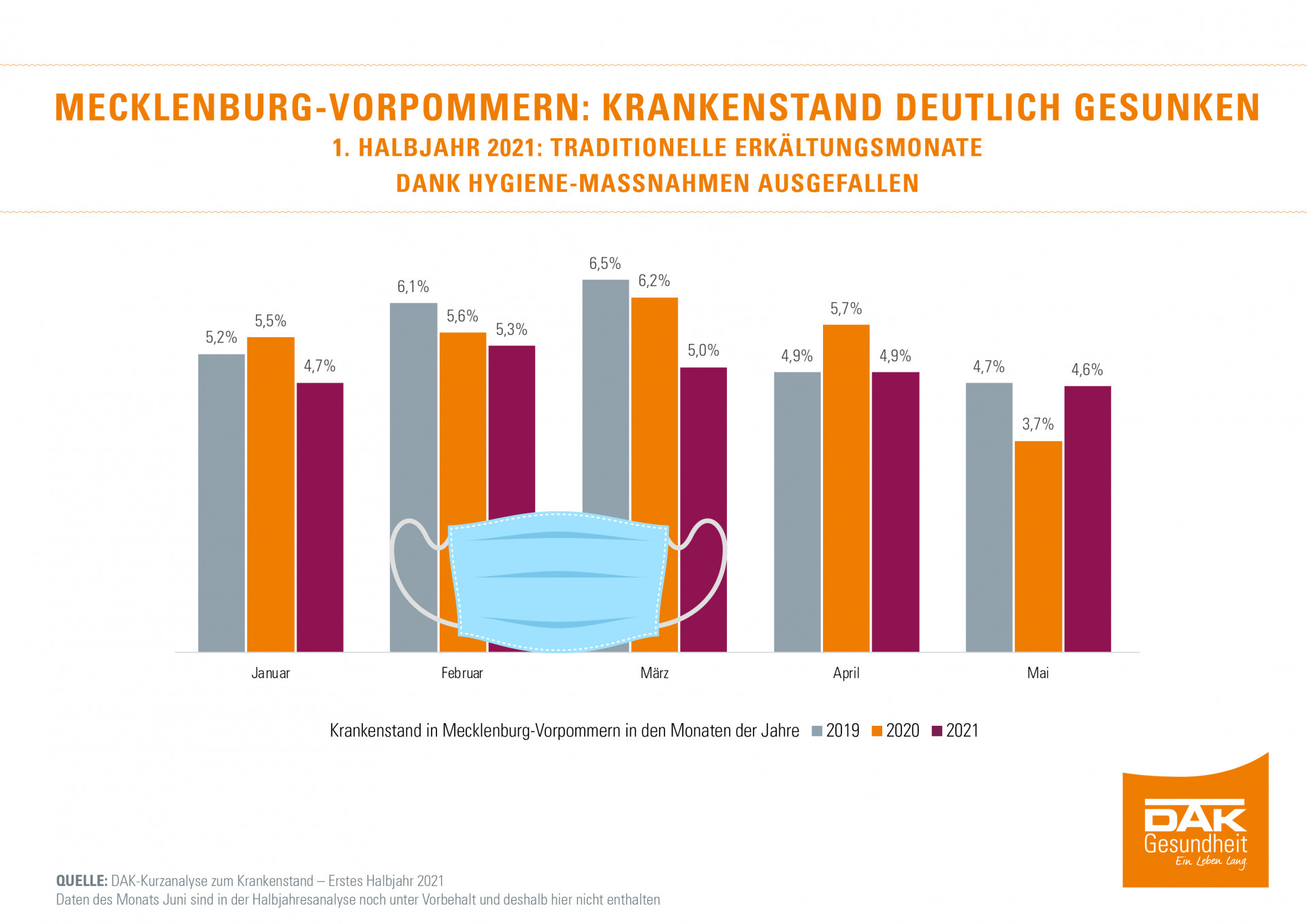 Im ersten Halbjahr 2021 gab es in Mecklenburg-Vorpommern ungewöhnlich wenig krankheitsbedingten Arbeitsausfall. Beschäftigte hatten von Januar bis Juni pro Kopf durchschnittlich 8,4 Fehltage und damit sechs Prozent weniger als im Vorjahreszeitraum. Der Krankenstand in MV ist um 0,3 Prozentpunkte zurückgegangen und liegt mit 4,6 Prozent deutlich über Bundesniveau (3,7). Das bedeutet, dass an jedem Tag durchschnittlich 46 von 1.000 Beschäftigten krankgeschrieben waren. Der niedrige Krankenstand hängt mit dem massiven Rückgang von Atemwegserkrankungen zusammen (minus 56 Prozent). Das geht aus der aktuellen Krankenstands-Analyse der DAK-Gesundheit für Mecklenburg-Vorpommern hervor. Die Kasse sieht die geltenden Abstands- und Hygienemaßnahmen während der Pandemie als Ursache. Der Rückgang betrifft alle Berufsgruppen, zeigt sich jedoch besonders dort, wo die Beschäftigten vermehrt im Homeoffice arbeiten konnten.