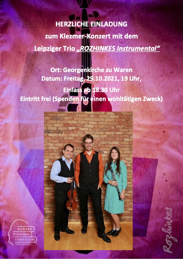 Das Konzert findet im Rahmen eines Projektes des Richard-Wossidlo-Gymnasiums statt. Durch eine vollumfängliche Förderung des Projektes durch die Landeszentrale für politische Bildung im Rahmen des Jubiläums „1700 jüdisches Leben in Deutschland“ erfolgt der Eintritt kostenfrei. Die Spenden des Konzertabends werden einem wohltätigen Zweck zu Gute kommen.