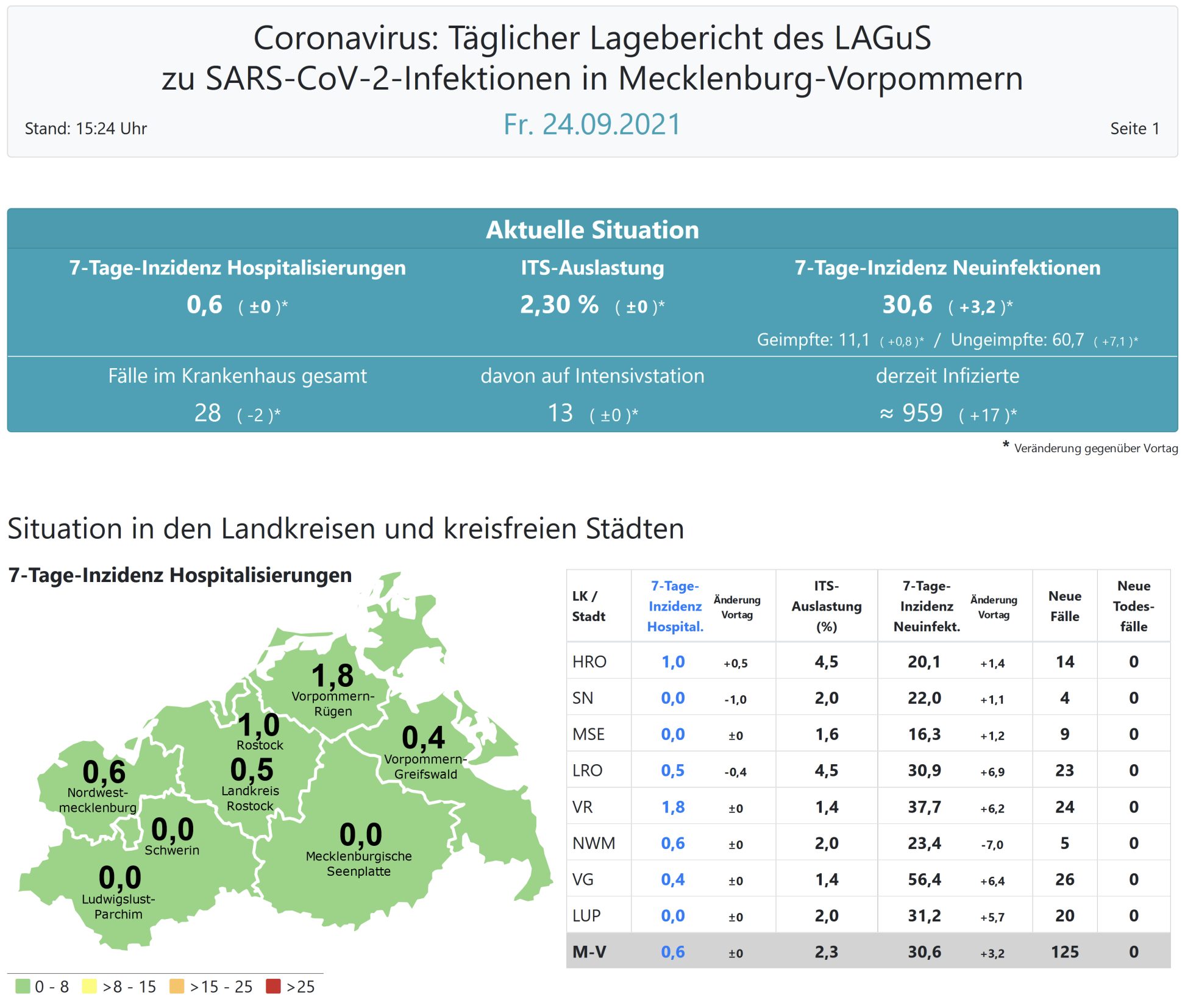 Die Hospitalisierung in ganz Mecklenburg-Vorpommern liegt weiterhin bei 0,6. Das Land Mecklenburg-Vorpommern meldet heute 125 Neuinfektionen und keinen neuen Todesfall.