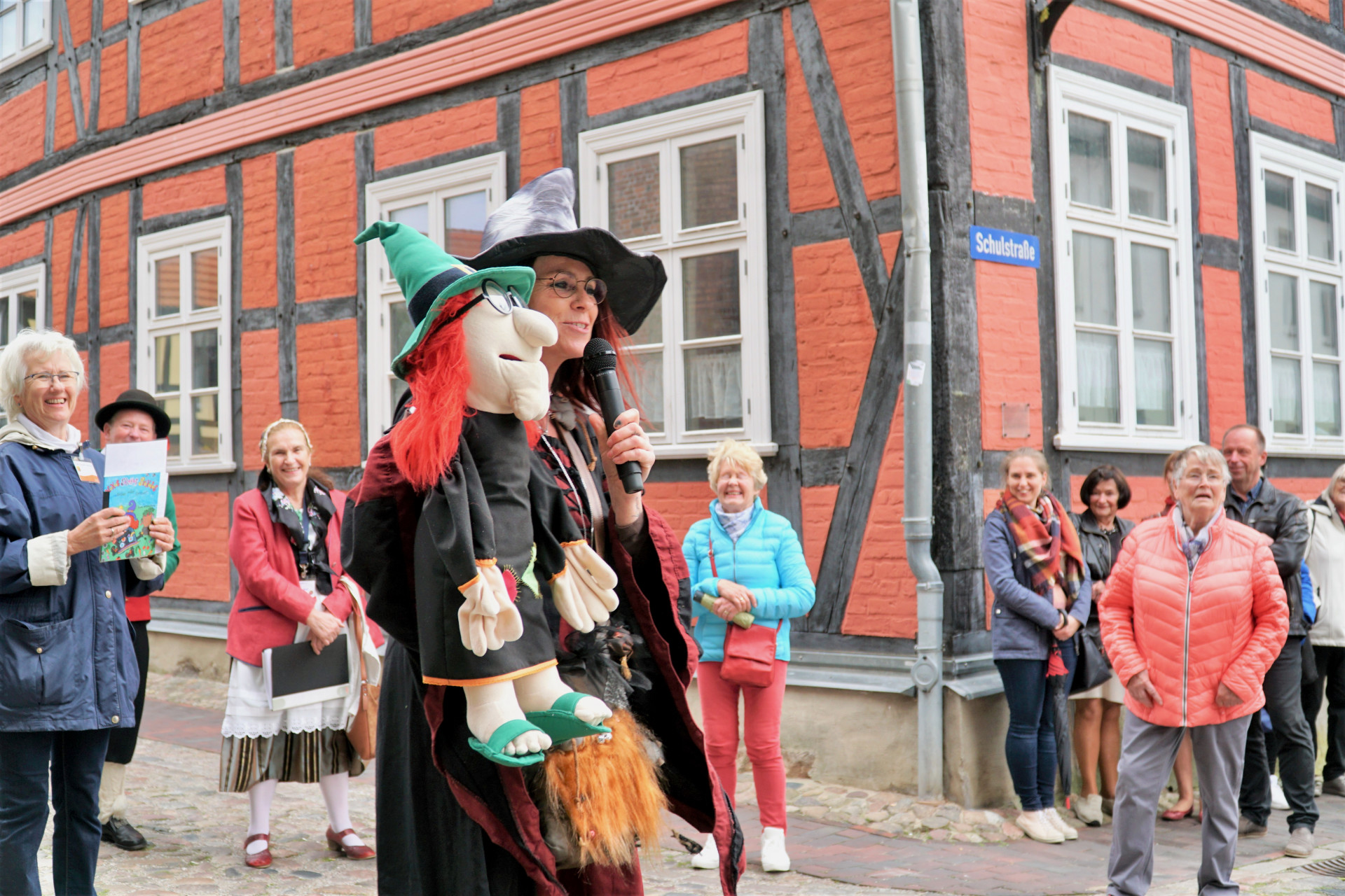 Ein Höhepunkt bei der besonderen Stadtführung war zweifelsohne die Autorin Ines Wittenberg, die seit einigen Jahren mit Kinderbüchern für Begeisterung sorgt. Die Warenerin „sprang“ – verkleidet als Hexe“ – aus dem Gebüsch und konnte mit Hilfe von „Schnattayaga“ einiges zum Besten geben.
