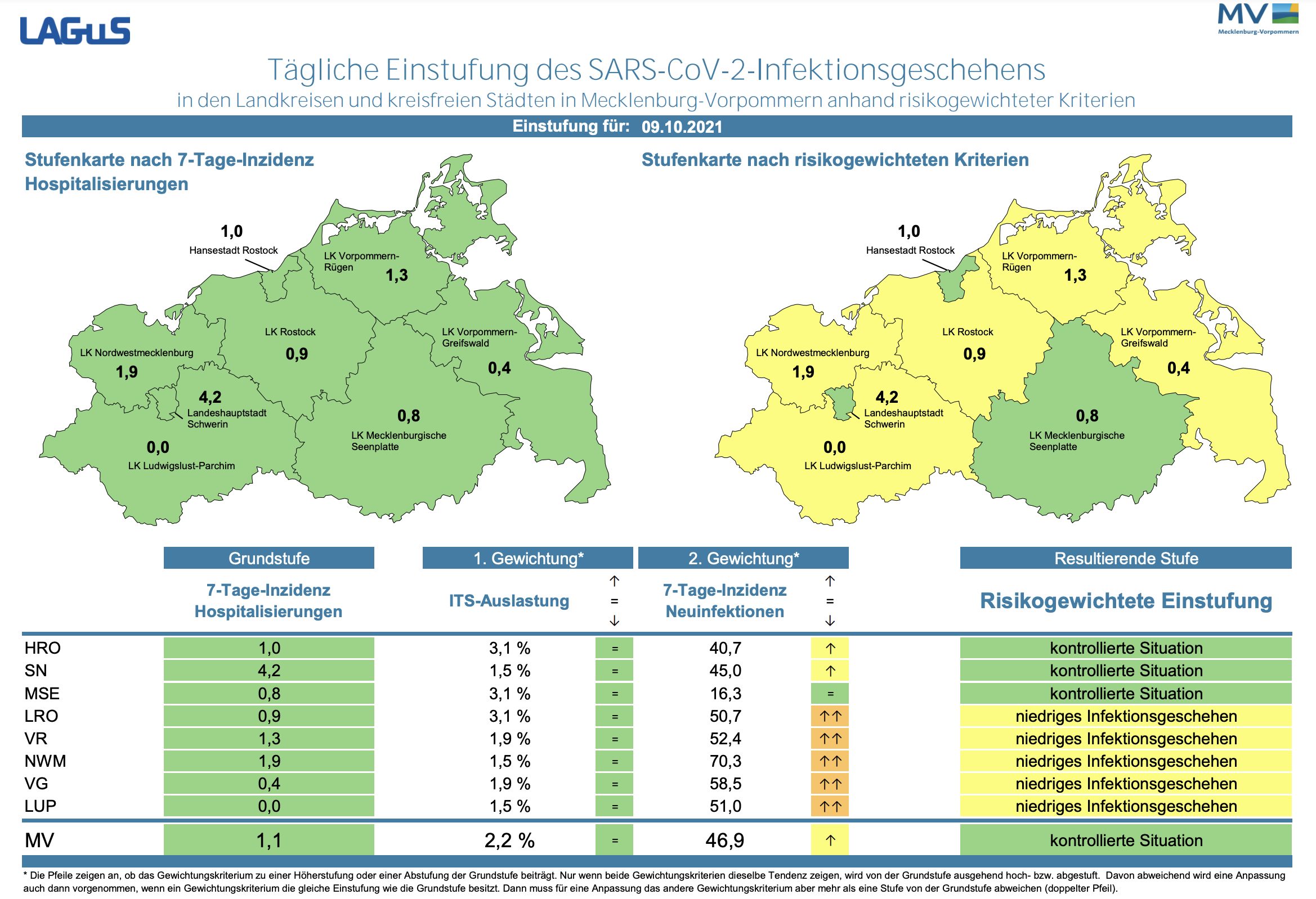 Die Hospitalisierung in ganz Mecklenburg-Vorpommern liegt jetzt bei 1,1, die Inzidenz des Landes ist nahezu unverändert und liegt bei 46,9 (gestern 47,2). Das Land Mecklenburg-Vorpommern meldet heute 99 Neuinfektionen und keinen neuen Todesfall.