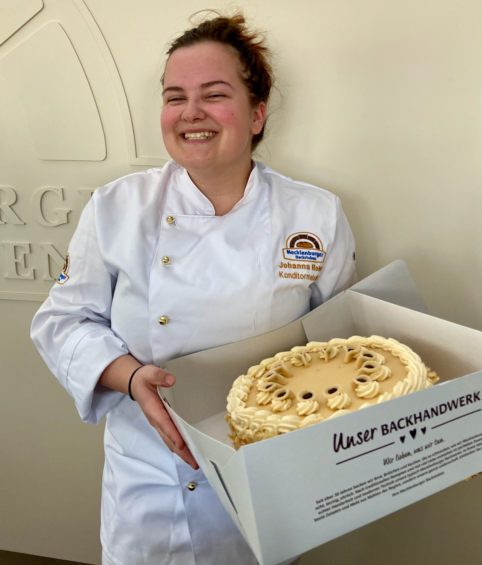 Sie ist sozusagen die süße „Geheimwaffe“ der Mecklenburger Backstuben GmbH: Johanna Rohde, 23 Jahre jung und frisch gebackene Konditormeisterin. Vor zwei Jahren siegte die sympathische Mecklenburgerin beim Landeswettbewerb der Konditoren, holte beim anschließenden Bundeswettbewerb den vierten Platz (WsM berichtete) und bezeichnet das Backen als eine Leidenschaft. „Da ist viel Herz dabei“, so Johanna. Die Siegprämie des Landeswettbewerbes nutzte sie für die Meister-Ausbildung, aber auch von ihrem Arbeitgeber wurde sie unterstützt. Heute hat die junge Frau nicht nur den Meistertitel in der Tasche, sondern ist Abteilungsleiterin der Backstuben-Konditorei und damit Chefin von zehn Mitarbeitern – fast alle sind älter als sie.