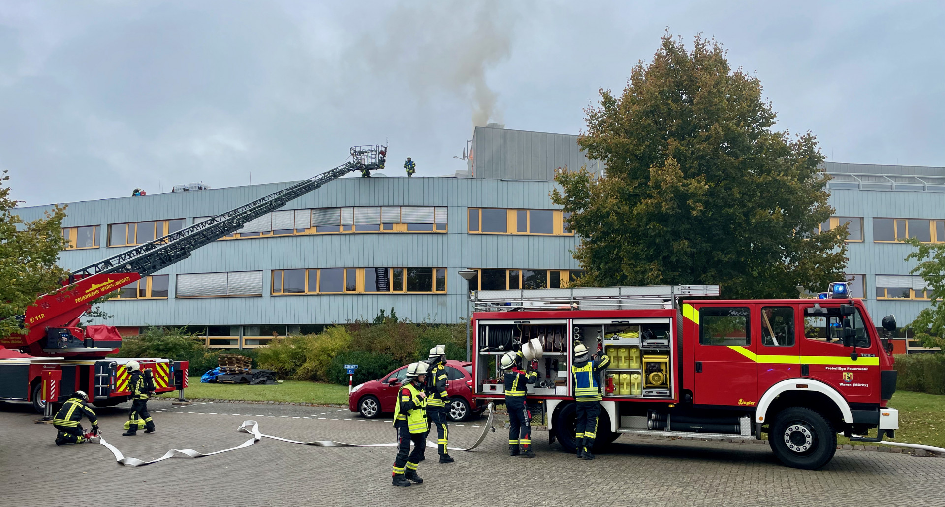 Großeinsatz heute am frühen Nachmittag in Waren: Bei Dacharbeiten hat die Fassade der Beruflichen Schule in der Warendorfer Straße Feuer gefangen. Die Schüler wurden umgehend evakuiert, im Einsatz waren neben den Kameraden aus Waren auch die Klinker Wehr und die Freiwilligen aus Groß Plasten.