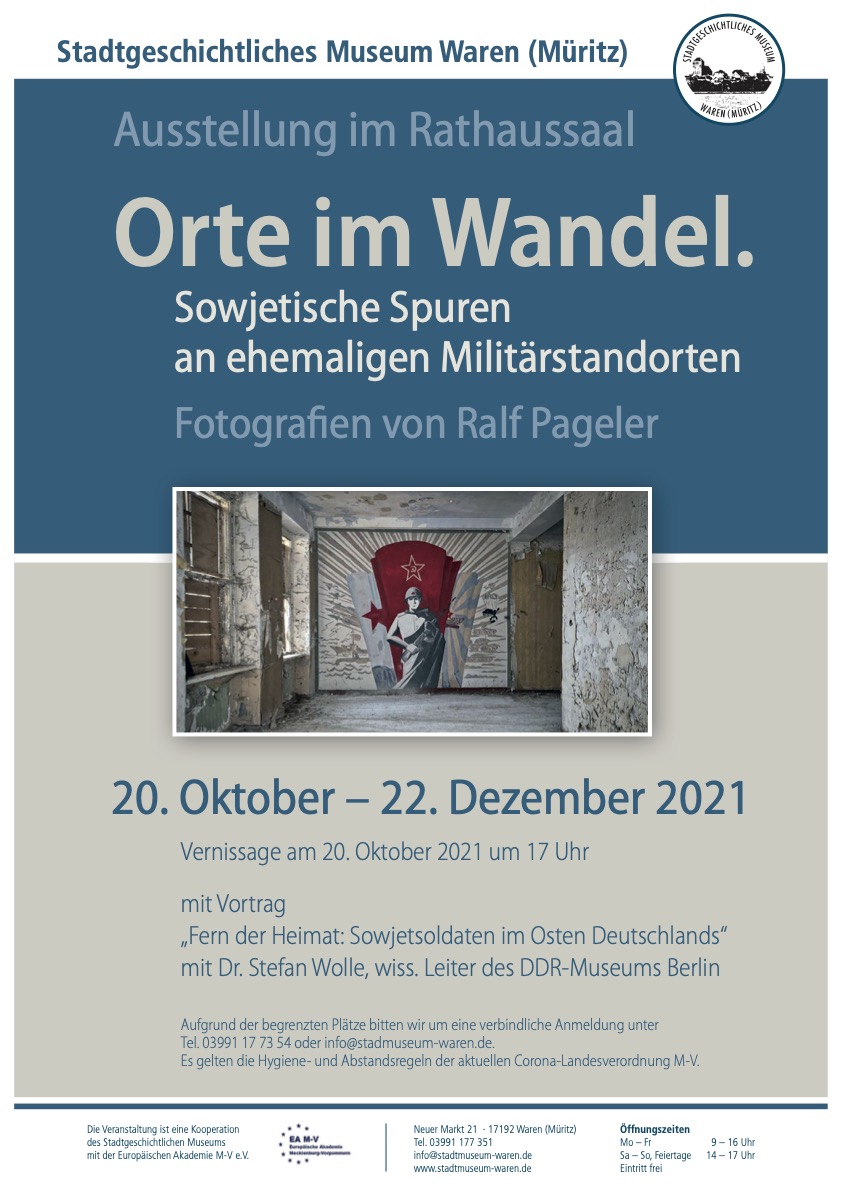 „Orte im Wandel. Sowjetische Spuren an ehemaligen Militärstandorten“ heißt eine Fotoausstellung, die am morgigen Mittwoch, 20. Oktober, um 17 Uhr im Warener Rathaussaal eröffnet wird. Eindrucksvoll schafft es der Künstler Ralf Pageler sowjetische Spuren auf den verfallen Kasernenstandorten einzufangen. Die Motive wirken wie Überbleibsel einer untergegangenen Zivilisation.