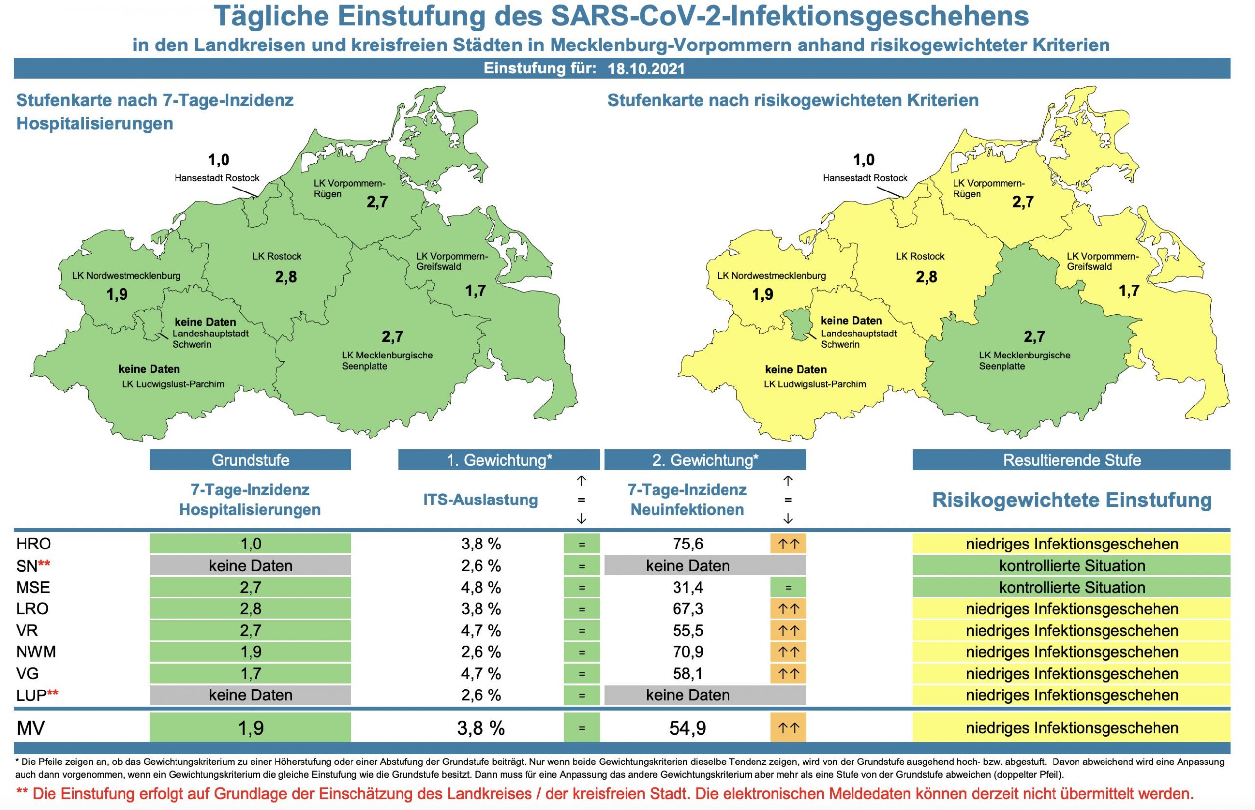Noch einmal die Infos zur neuen Karte: Dort finden Sie zum einen eine Grafik mit der aktuellen Hospitalisierungs-Übersicht (links) und zum anderen die neue Risiko-Grafik, nach der sich auch die aktuellen Corona-Maßnahmen in Mecklenburg-Vorpommern richten. Auf Wunsch zahlreicher Leser veröffentlichen wir zudem zusätzlich die zweite Karte, auf der auch der Inzidenzwert – unterteilt nach Geimpften und Ungeimpften – zu sehen ist.