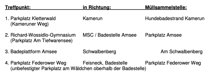 Folgende Treffpunkte und Müllsammelstellen werden betreut:
