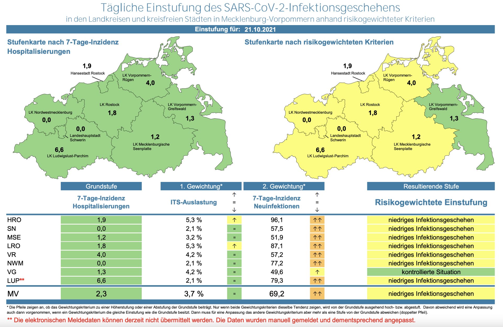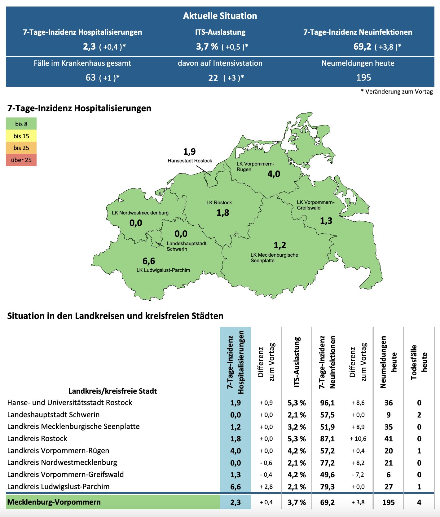 Die Hospitalisierung in ganz Mecklenburg-Vorpommern ist liegt heute bei 2,3 (gestern 1,9). Die Inzidenz des Landes ist gestiegen und liegt bei 69,2 (gestern 65,4). Das Land Mecklenburg-Vorpommern meldet heute 195 Neuinfektionen und vier neue Todesfälle.