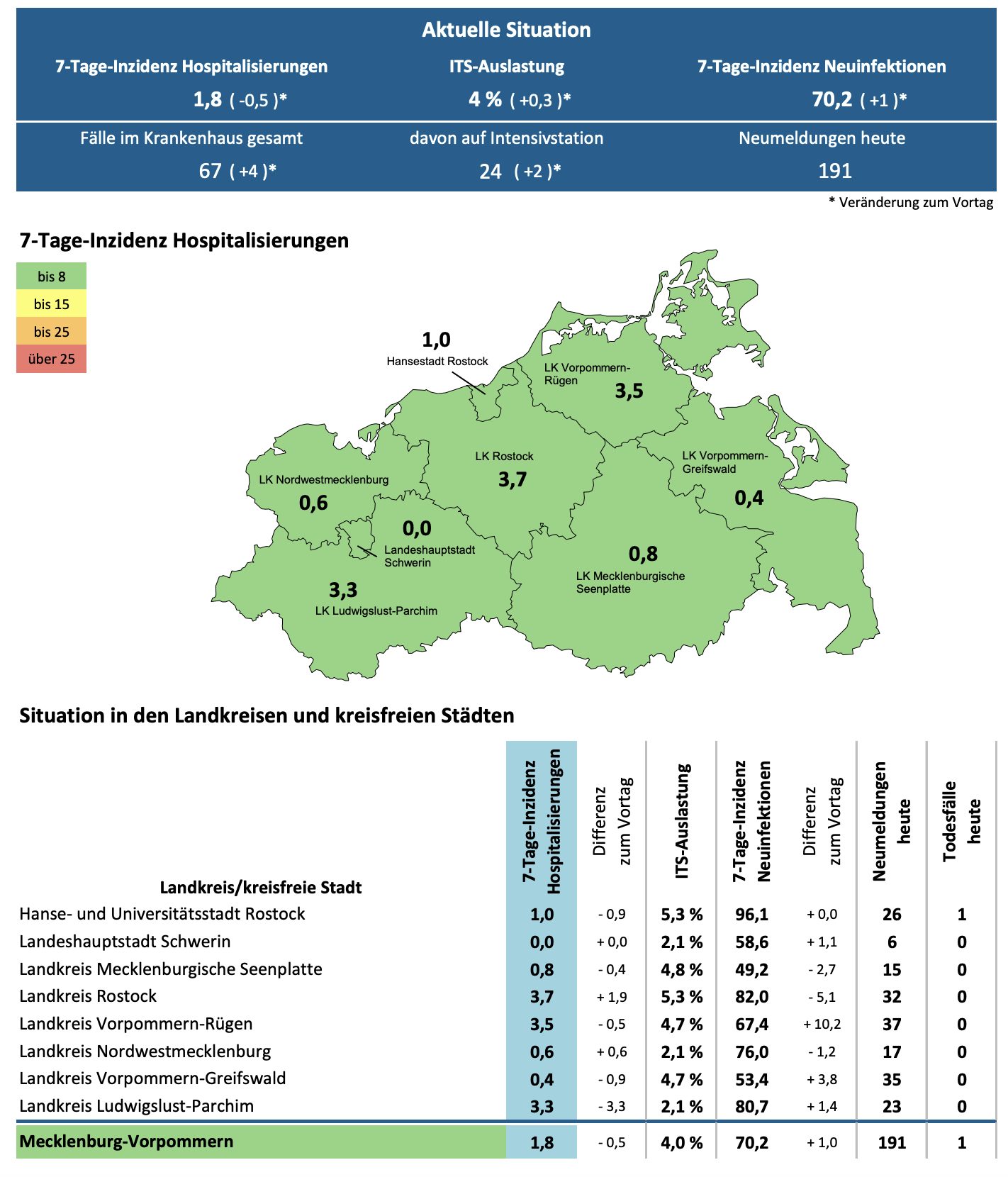 Die Hospitalisierung in ganz Mecklenburg-Vorpommern ist ebenfalls gesunken und liegt heute bei 1,8 (gestern 2,3 ). Die Inzidenz des Landes ist leicht gestiegen und liegt bei 70,2 (gestern 69,2). Das Land Mecklenburg-Vorpommern meldet heute 191 Neuinfektionen und einen neuen Todesfall.