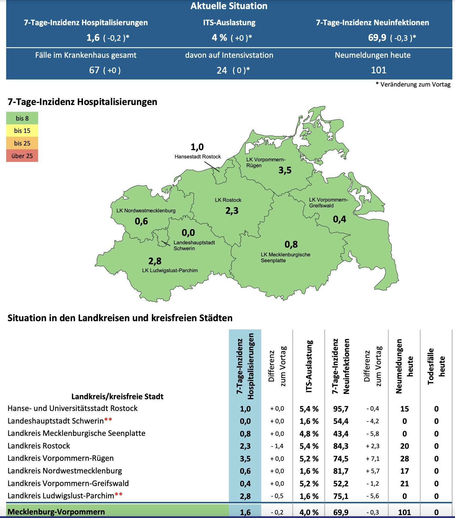 Die Hospitalisierung in ganz Mecklenburg-Vorpommern ist gesunken und liegt heute bei 1,6 (gestern 1,8 ). Die Inzidenz des Landes ist leicht gesunken und liegt bei 69,9 (gestern 70,2). Das Land Mecklenburg-Vorpommern meldet heute 101 Neuinfektionen und keinen neuen Todesfall.