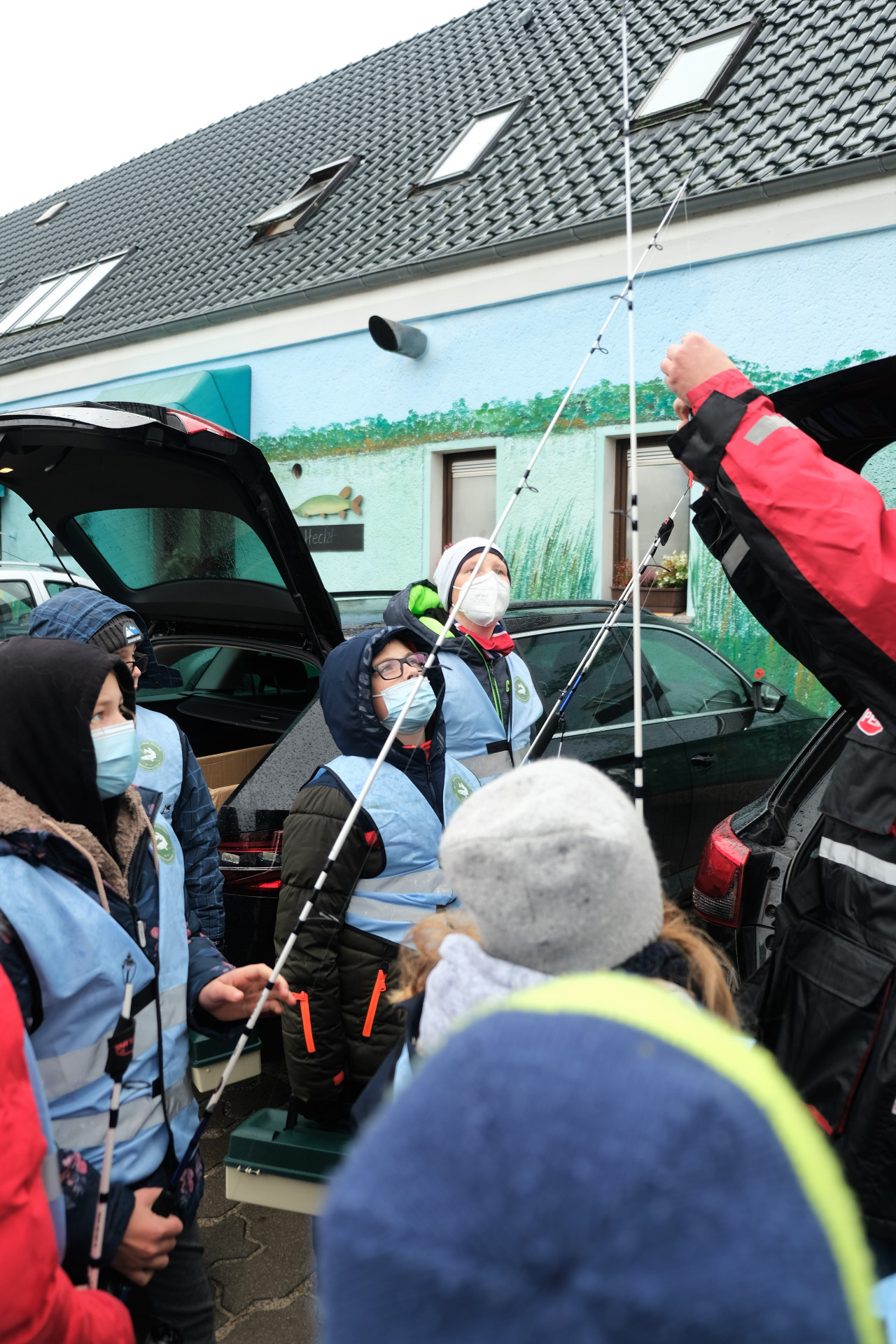 „In Alt-Schwerin angekommen wurden wir freundlich von Hans-Joachim Behncke, einem der drei Geschäftsführer, empfangen, bekamen einen kurzen historischen Abriss des Unternehmens, und die Kinder konnten erwartungsvoll einen ersten Blick auf den Angelteich, in dem die Forellen schwimmen, erhaschen. Anschließend führte uns der Weg „backstage“ zu den Hälterungsanlagen sowie zu den Verarbeitungsräumen, in denen die Fische filetiert und weiterverarbeitet werden“, berichtet Martin Pianka, der das Angelprojekt gemeinsam mit Torsten Krüger leitet.