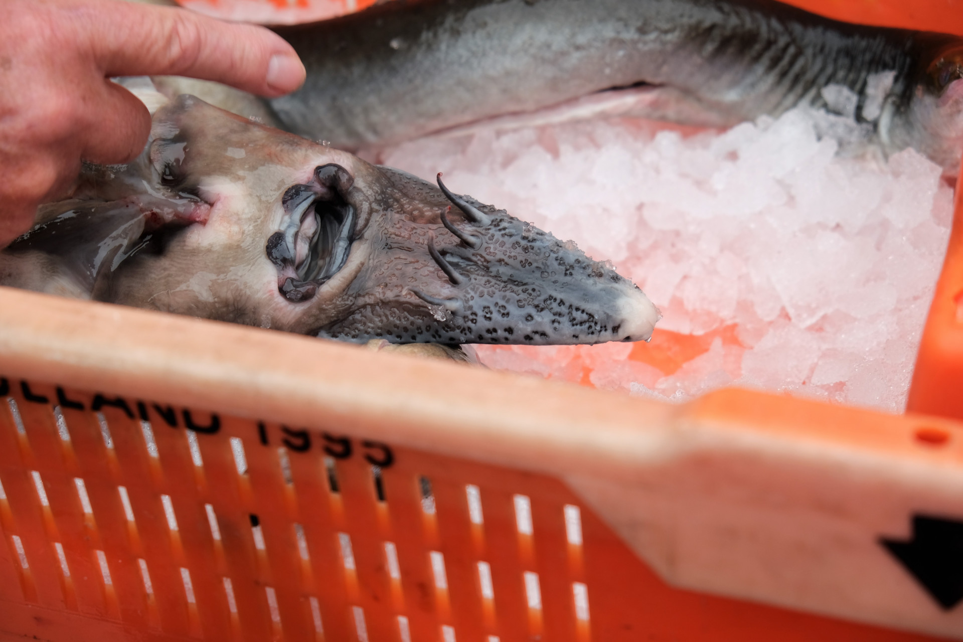 Nach der Rutschpartie hatten die Kinder die Möglichkeit, die riesigen Störe zu besichtigen, die auf den ersten Blick alle gleich aussahen. Geschäftsführer Behncke wies darauf hin, genauer hinzusehen, um die Fische im Detail wahrzunehmen. Dabei stellten die Besucher fest, dass jeder Fisch ein individuelles Muster und eine individuelle Färbung hat. Bei Stören spricht man bei der hellen Färbung der Köpfe ähnlich wie auch bei Pferden von der sogenannten „Blesse“, die bei jedem Fisch anders ist, so dass man Otto, Fritz, Inge und Co. an ihrem Aussehen erkennen kann.