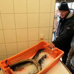 Perfekt „getimed“ zum Besuch der jungen Angler kam eine neue Ladung Saiblinge, Regenbogenforellen und Lachsforellen. Dabei erklärte der erfahrene Fischer, dass sich die Lachsforelle geschmacklich nicht sonderlich von den anderen Forellen unterscheidet. Das rötliche Fleisch, das die Lachsforelle besonders machet, werde lediglich durch das Zufüttern von karotinhaltiger Nahrung erzeugt, was den Fisch im Restaurant dann optisch aufwerte.