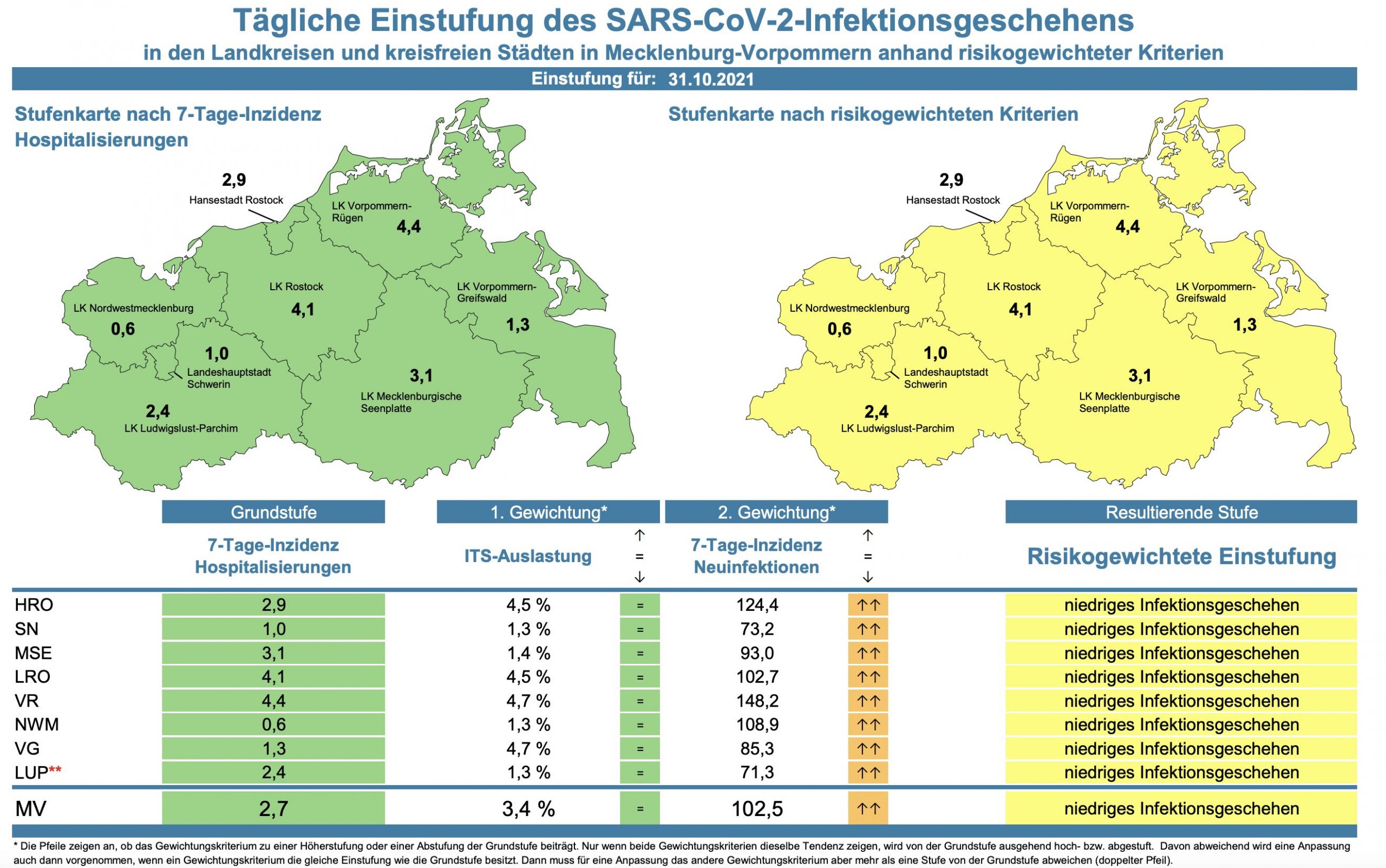 Die Hospitalisierung in ganz Mecklenburg-Vorpommern ist von 2,2 auf 2,7 gestiegen. Die Inzidenz des Landes stieg von 99,3 auf 102,5. Das Land Mecklenburg-Vorpommern meldet heute 129 Neuinfektionen und zwei neue Todesfälle.