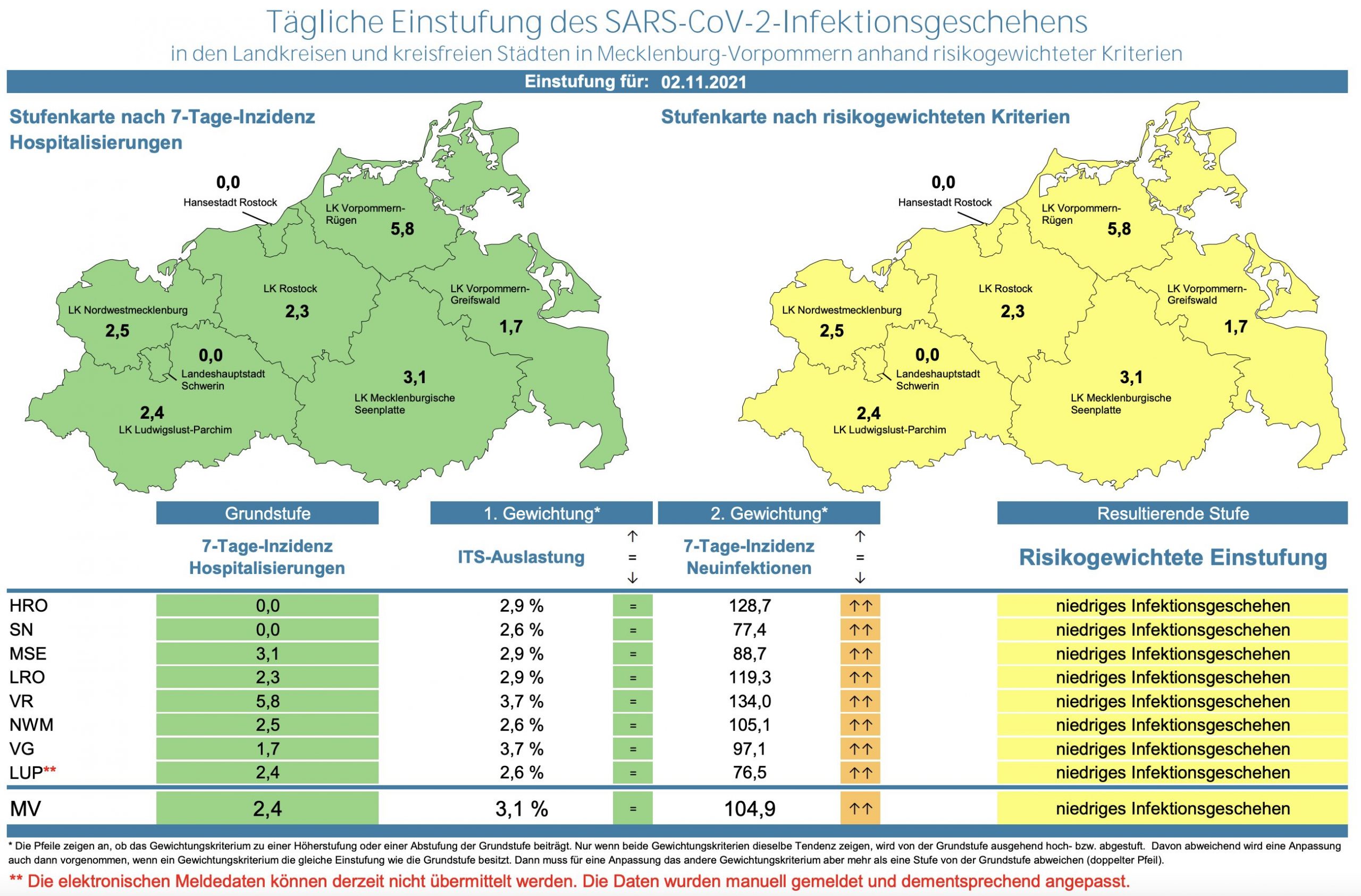 Die Hospitalisierung in ganz Mecklenburg-Vorpommern ist von 2,2 auf 2,4 gestiegen. Die Inzidenz des Landes sank von 105,4 auf 104,9. Das Land Mecklenburg-Vorpommern meldet heute 415 Neuinfektionen und keinen neuen Todesfall.