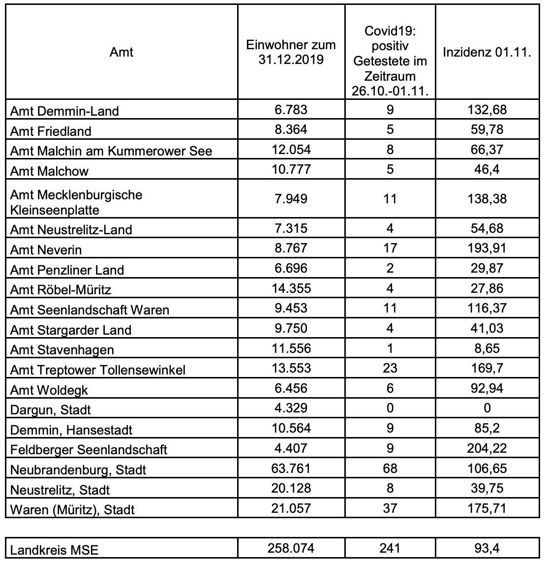 Unter diesem Artikel finden Sie, liebe Leser, heute auch wieder die Inzidenzen des Landkreises Mecklenburgische Seenplatte – aufgeschlüsselt nach Städten und Ämtern.
