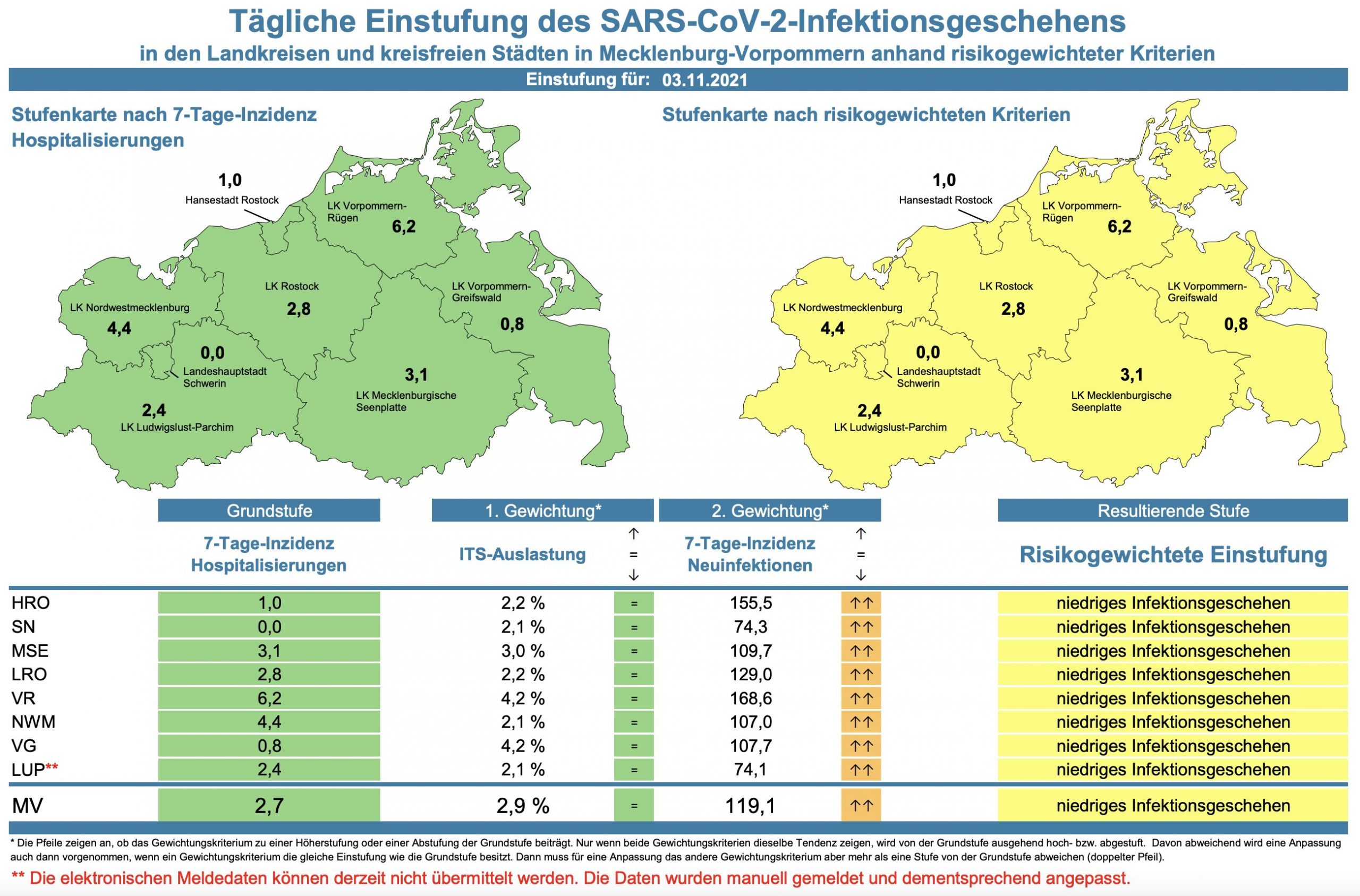 Die Hospitalisierung in ganz Mecklenburg-Vorpommern ist von 2,4 auf 2,7 gestiegen. Die Inzidenz des Landes stieg von 104,9 auf 119,1. Das Land Mecklenburg-Vorpommern meldet heute 516 Neuinfektionen und drei neue Todesfälle.