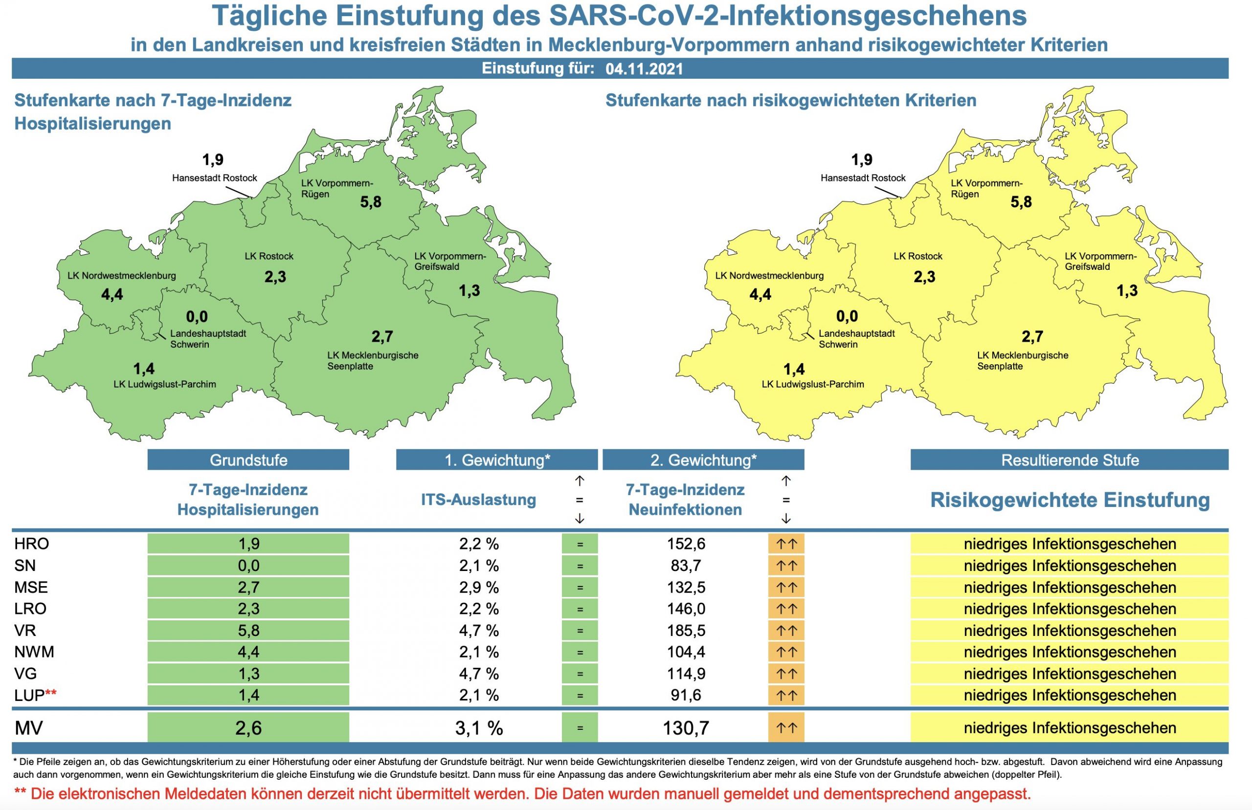 Die Hospitalisierung in ganz Mecklenburg-Vorpommern ist von 2,7 auf 2,6 gesunken. Die Inzidenz des Landes stieg von 119,1 auf 130,7. Das Land Mecklenburg-Vorpommern meldet heute 469 Neuinfektionen und vier neue Todesfälle.