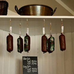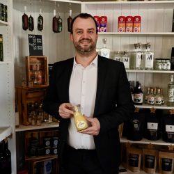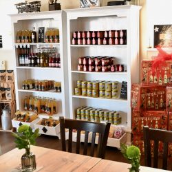 So finden sich in den Regalen unter anderem Produkte der Müritzfischer oder der schon allseits bekannte Müritz Gin, Rapsöl von der Insel Rügen, selbst gemachtes Schmalz und Wildsalami aus eigener Jagd. Da stehen Marmeladen aus Früchten, die auf dem Schloss-Areal wachsen, neben Essig aus eigener Produktion sowie ein Löffel-Eierlikör aus Eiern von den 220 Araucana-Hühnern, die auf dem Grundstück leben. Nicht zu vergessen der Schloss-Apfelsaft oder der Schloss-Apfel-Birnen-Saft – alles natürlich aus den eigenen Früchten. Immerhin wachsen am Fleesensee gut 3000 Obstbäume und die haben im vergangenen Jahr beispielsweise für etwa 3000 Liter Apfelsaft gesorgt. „In den Minibars unserer Zimmer bieten wir diesen Saft an, und der kommt so gut an, dass sich viele Urlauber dann im Shop damit eindecken“, erzählt Schloss-Direktor Harald Schmitt. Auch seine Frau steuert etwas bei: Sie ist bekannt für ihre tollen Fruchtaufstriche und begeistert unter anderm mit Quitten-Gelee – hergestellt aus eigenen Produkten.